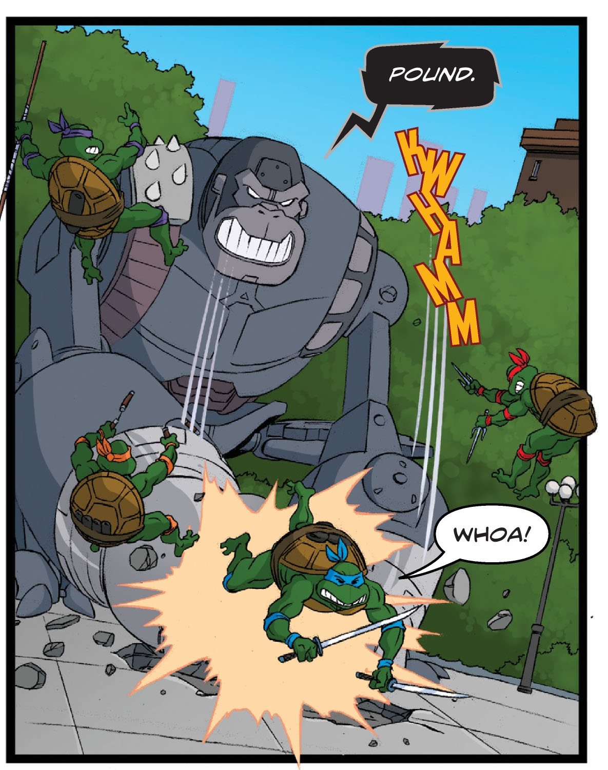 April couvrait un nouveau combat des tortues, qui affrontaient un robot gorille géant échappé des laboratoires du T.C.R.I. La machine envoyait Michelangelo contre Vernon qui brisait sa caméra. L’homme était furieux, mais l’adolescent repartait immédiatement au combat. Hélas pour les quatre frères, la machine était inarrêtable et très résistante. C’est alors que le robot se fit détruire par des tirs lasers venus du ciel. Il s’agissait des neutrinos, qui venaient chercher leurs amis. Ils avaient des ennuis !