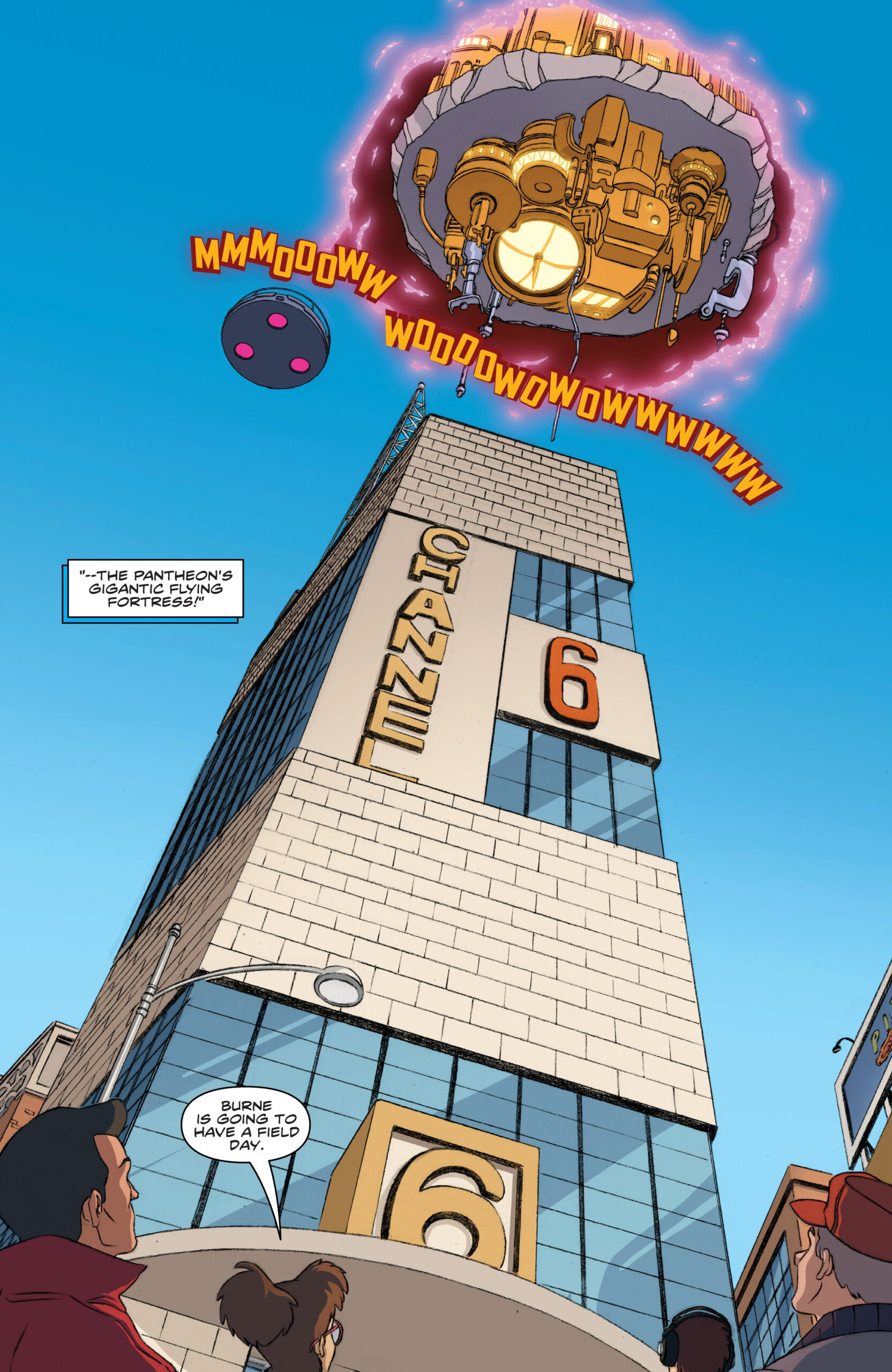 Dans le ciel, au-dessus de New York, un portail géant s’ouvrait pour laisser apparaître la forteresse mobile du Pantheon. Elle était effectivement gigantesque. Les ennemis s’en allaient à bord de la passerelle, criant victoire…