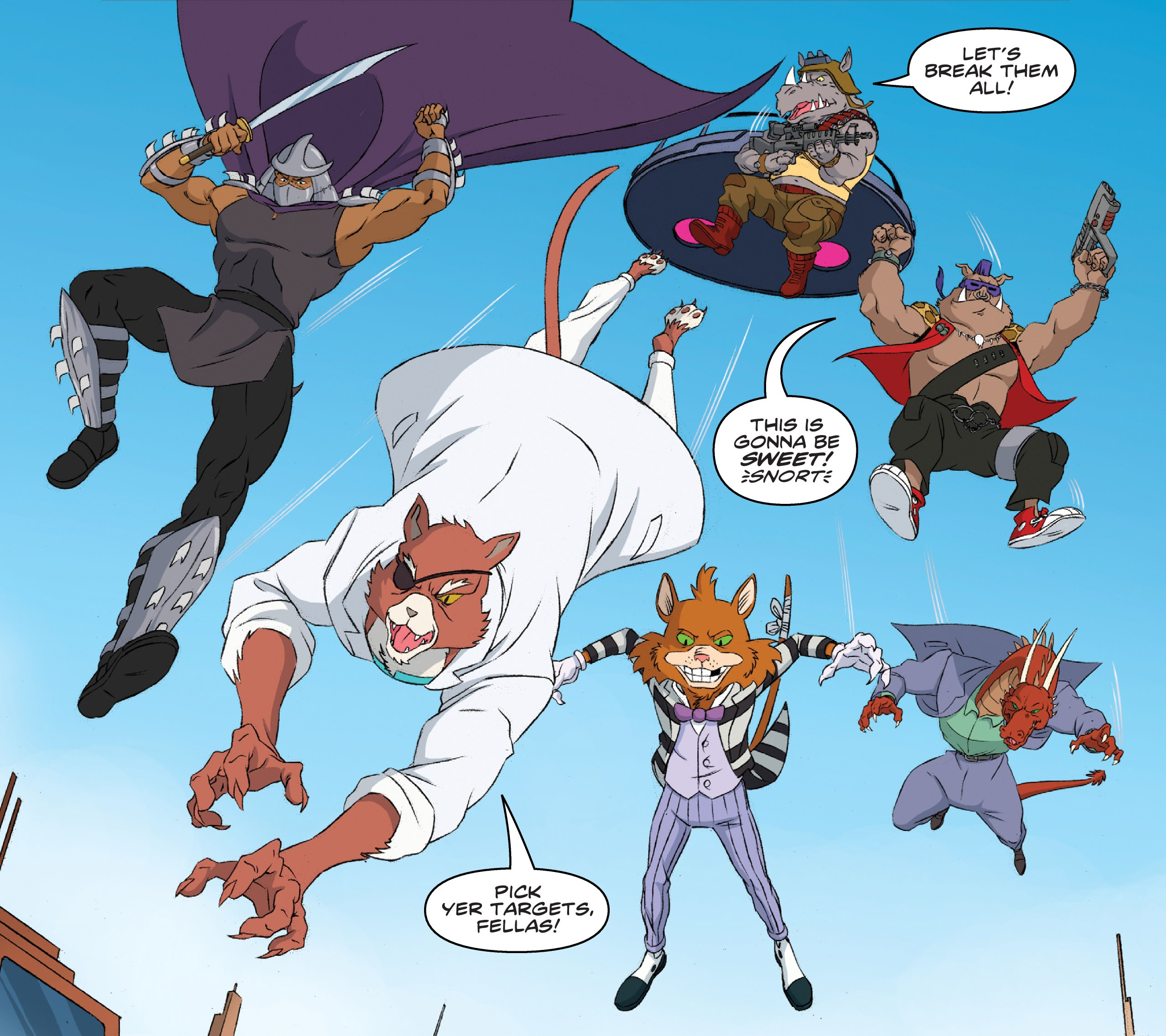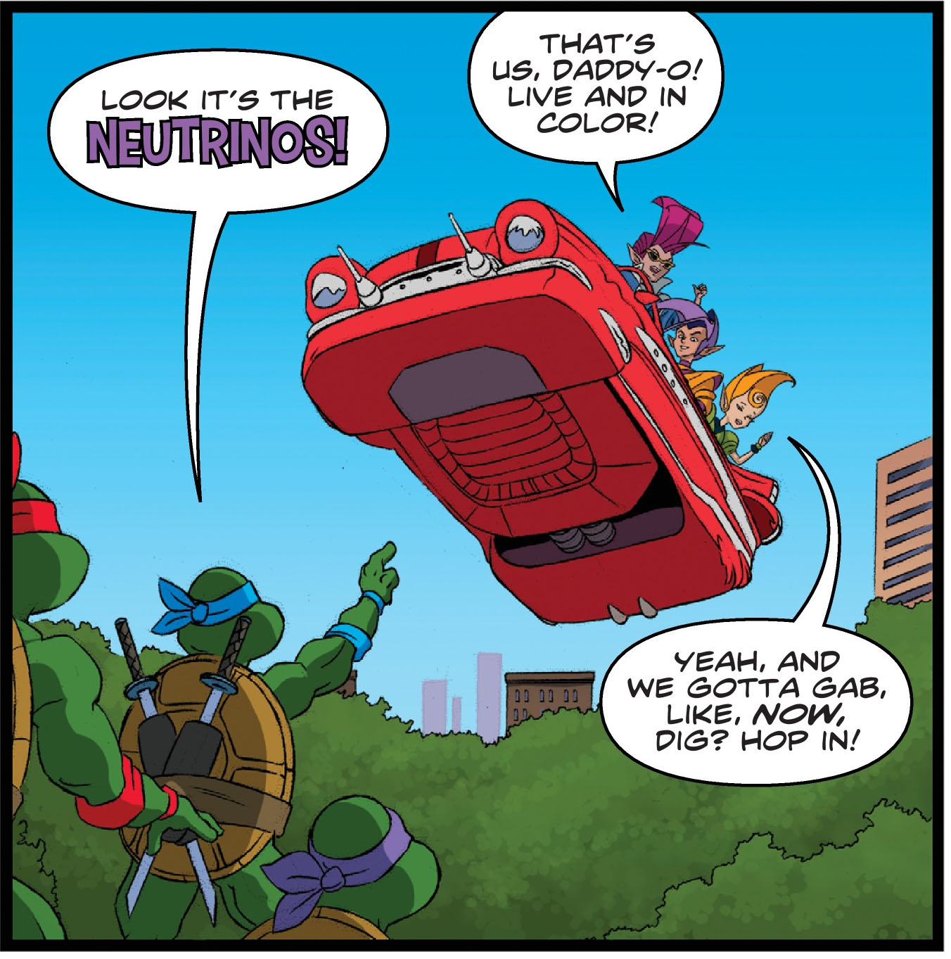 The members of the Pantheon have been patient, constructing a way to bring their massive mobile base to Earth and begin conquering. The Ninja Turtles would’ve been caught completely off guard if the Neutrinos hadn’t noticed a massive surge of interdimensional energy in Dimension X. They know a gigantic portal is about to open, and they know it’s not the Technodrome doing it! The hot-rodding aliens make their way to Earth to warn their reptilian ninja pals and present a way to maybe keep the portal from opening…but Shredder and Old Hob aren’t going to just stand by and let them foil their plans. “The Perils of the Pantheon” starts here!