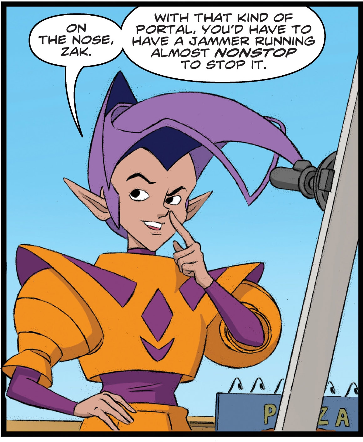 Les tortues à bord du bolide volant, les neutrinos leurs expliquaient qu’une catastrophe était sur le point de se produire sur Terre. Alors qu’ils se promenaient en Dimension X, leur véhicule avait intercepté un signal puissant ; celui d’un portail sur le point de s’ouvrir. Les trois adolescents insouciants pensaient que cela venait du Technodrome, mais la forteresse de Krang était toujours une épave. En réalité, ce signal provenait d’ailleurs, mais était suffisamment puissant pour laisser passer quelque chose de gigantesque jusqu’à la Terre. Si les neutrinos semblaient parfaitement sérieux, Zak avait une bonne nouvelle. Il possédait un appareil capable de court-circuiter le portail et désactiver la machine qui cherchait à atteindre la planète de leurs amis. Après cela, tout serait à refaire et espérait qu’ainsi, leur ennemi, quel qu’il soit, abandonne son entreprise. Ils se dirigeaient vers une antenne au sommet d’un immeuble pour débuter leur expérience.