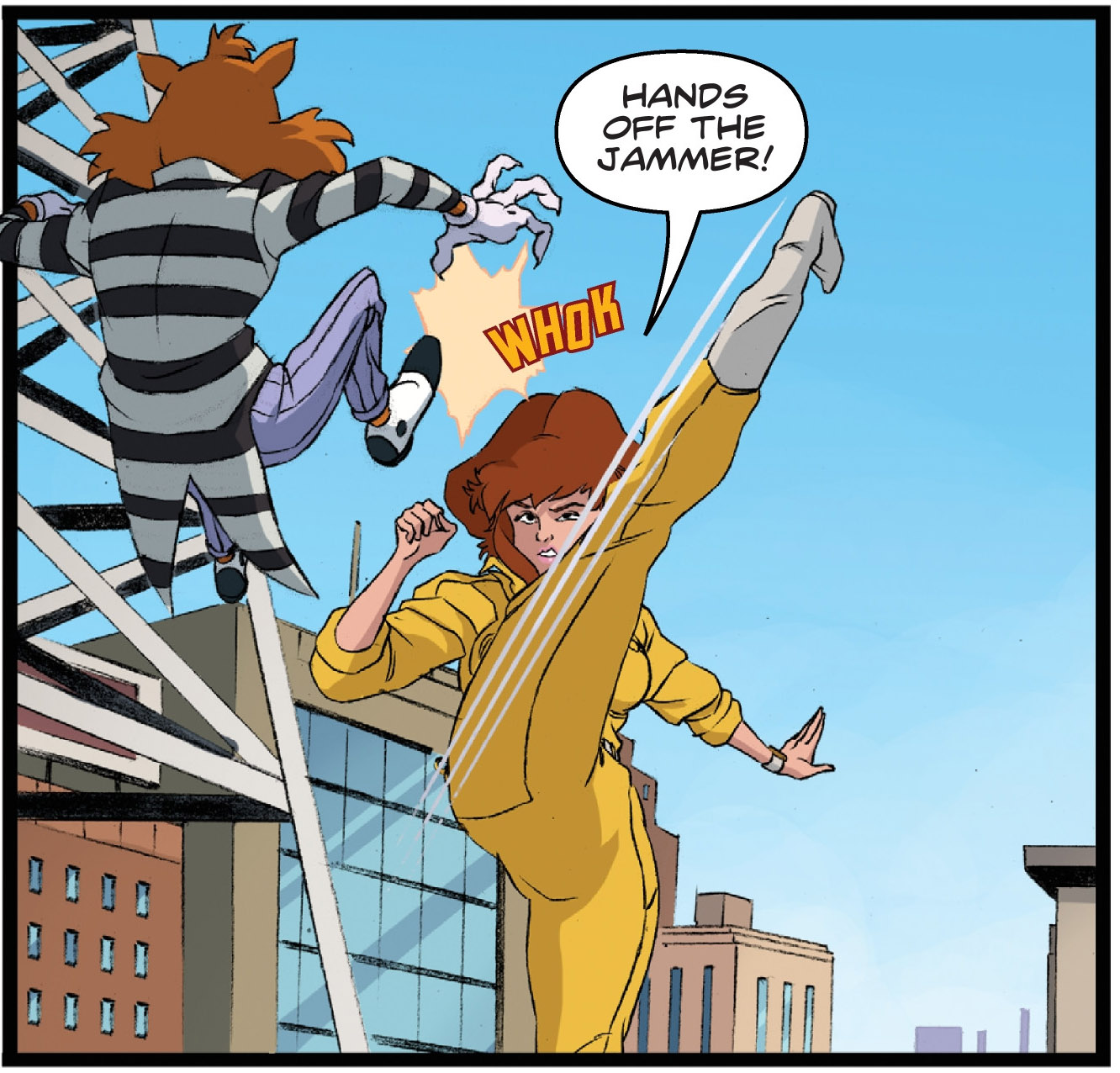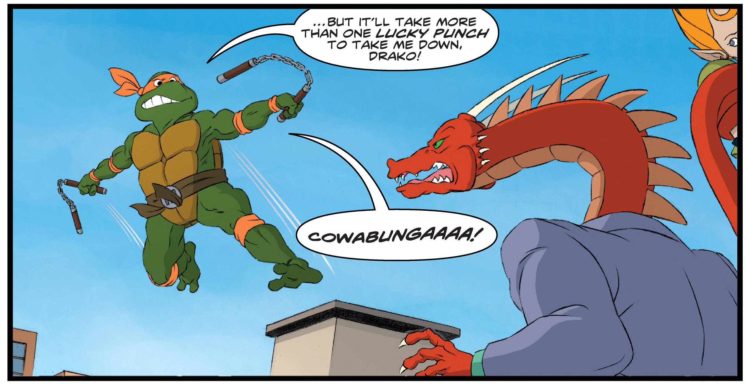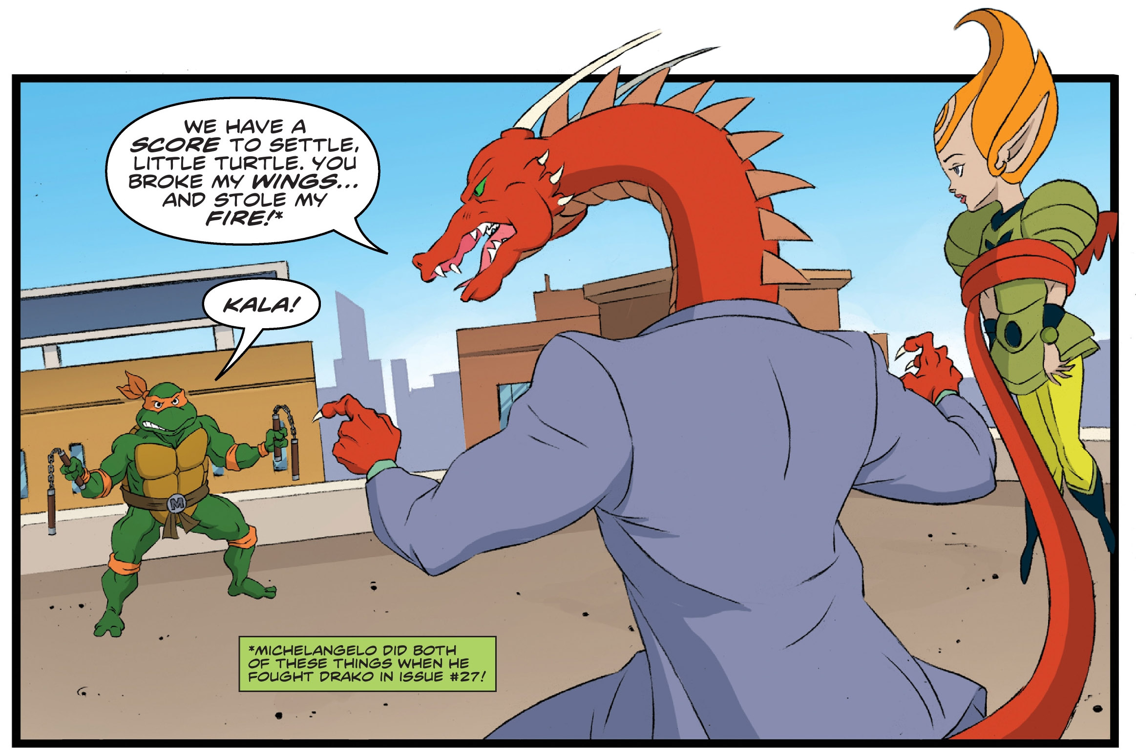 Ils étaient interrompus par la passerelle volante de Shredder, accompagné de Bebop, Rocksteady, Old Hob, Drako et Scratch. Tous sautaient sur le toit de l’immeuble pour en découdre avec les tortues et leurs amis. Les neutrinos possédaient des blasters qui matérialisaient des poings pour repousser les mutants qui les agressaient. Drako saisissait Kala, ce qui rendait Michelangelo fou. La tortue était balayée par le dragon, venu pour se venger de la perte de ses ailes et de son souffle de feu (SMA #27). Pendant le combat, April apercevait Scratch en train de retirer l’appareil des neutrinos. Elle lui flanquait un puissant coup de pied, grâce aux quelques cours de Splinter. Mais il était trop tard, le brouilleur était détruit.