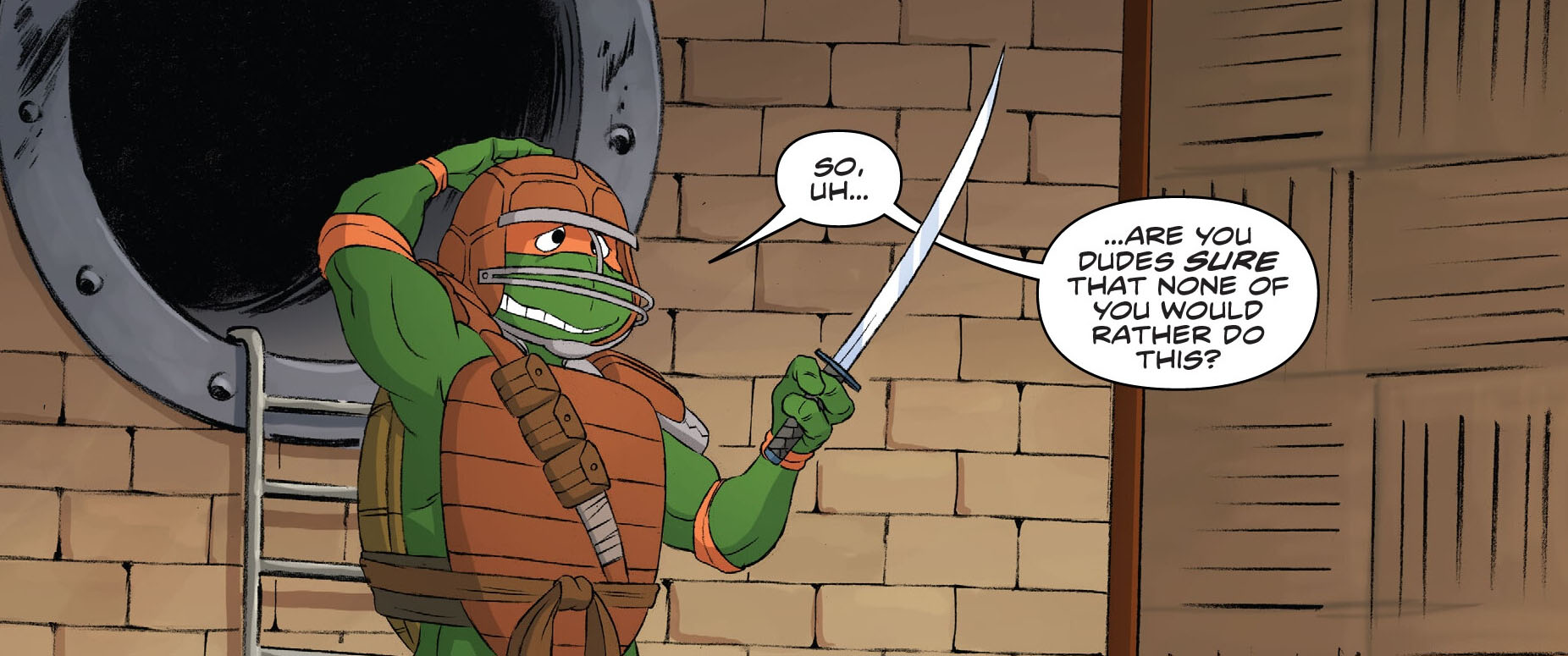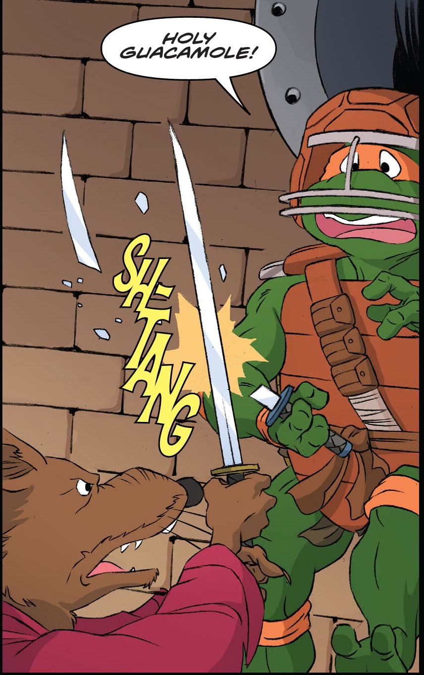 Dans le repaire, les tortues allaient assister à un nouvel enseignement de leur maître. Michelangelo revêtait une combinaison de protection et brandissait un sabre. Il n’était clairement pas serein. Raphael se moquait de lui, tandis que Donatello allait filmer ce qui suivrait, « pour la postérité » disait-il. Leonardo devait en apprendre plus et voulait observer la nouvelle leçon de leur maître. Enfin, Splinter rassurait son élève. Il le mettait en garde avant de le frapper de sa lame. La tortue ripostait avant de lui asséner un coup. Soudain, son épée se brisait en morceaux.