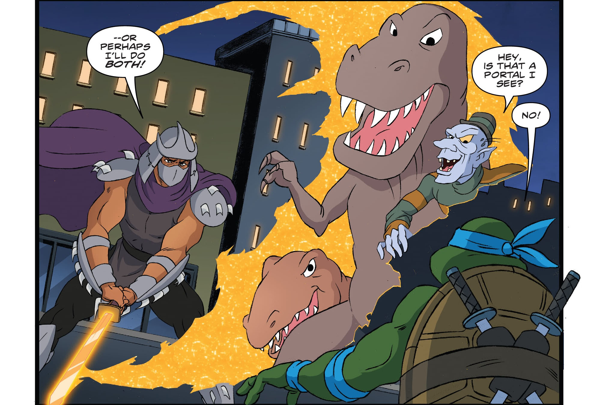 Le combat ne serait pas long. La cohue provoquée par le vol devrait alerter rapidement la police. Tandis que les ninjas s’occupaient du rhinocéros et du phacochère, Leonardo livrait un combat acharné contre Shredder. Le temps pressait pour les voleurs. L’homme au masque de fer fendait l’air de sa lame, rechargée, pour faire apparaître des dizaines de Foot soldiers. Les tortues auraient encore fort à faire dans cette rue ! Pour le déstabiliser, les quatre frères rabaissaient leur adversaire, lui rappelant qu’il était bien moins fort que leur maître. Shredder voyait clair dans leur stratégie. Le pousser à commettre une erreur et perdre le combat. Il en faudrait bien plus ! Son sabre, entièrement rechargé par le duel face à Leonardo, l’homme au masque de fer fendait de nouveau l’air et ouvrait un portail qui faisait apparaître à la fois des dinosaures et Creepy Eddie.