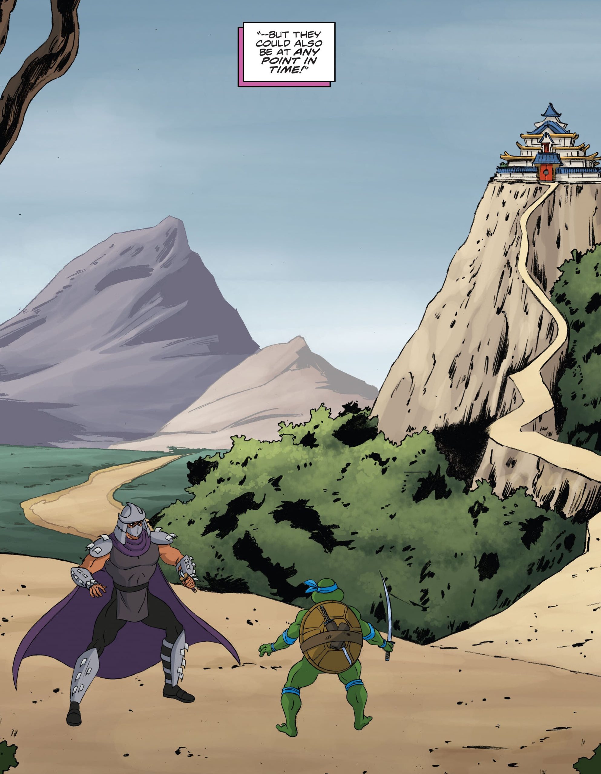 Leonardo et Shredder apparaissaient dans un paysage totalement différent de la jungle urbaine de New York. Leurs pieds foulaient la terre. Les arbres parsemaient un décor fait de nombreuses montagnes. Au sommet de l’une d’elles se trouvait un château de style japonais…