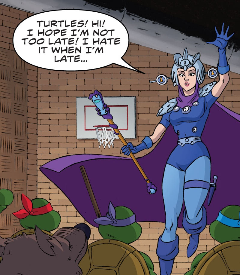 Donatello était très surpris par ce qu’il venait de voir. Cela défiait les lois de la physique ! Cette botte secrète pouvait être contrée par un grand maître tel que Shredder. Mais d’autres guerriers, moins expérimentés, risqueraient d’être surpris. Alors que le rongeur s’apprêtait à enseigner ce coup à Leonardo, quelque chose apparut dans le repaire. Une forme féminine, dans les airs. Il s’agissait de Renet, que les tortues de cet univers ne connaissaient pas encore.