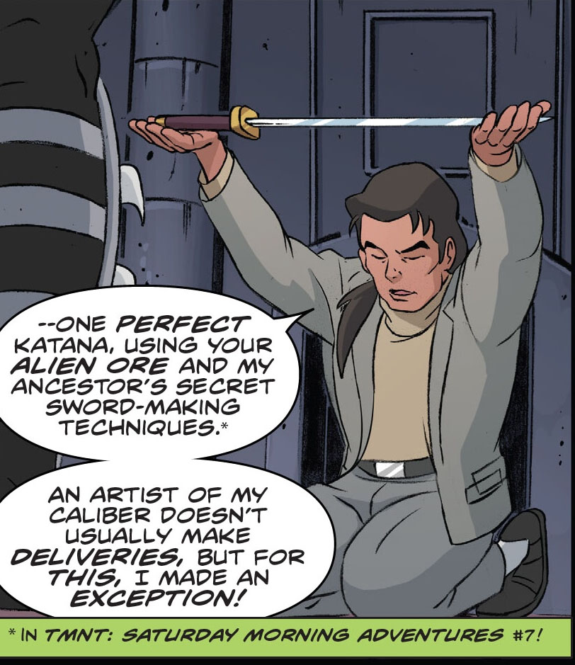 Donatello se penchait sur les éclats de l’épée de Shredder, qui gisaient encore au sol. Il en ramassait quelques morceaux, se souvenant de l’épée utilisée par leur ennemi quelques années auparavant (L’épée de nulle part, S3 E13). Ils partaient pour le TCRI. La tortue voulait en savoir plus sur cette lame. Il devait y avoir un lien avec l’apparition de Renet dans leur repaire.