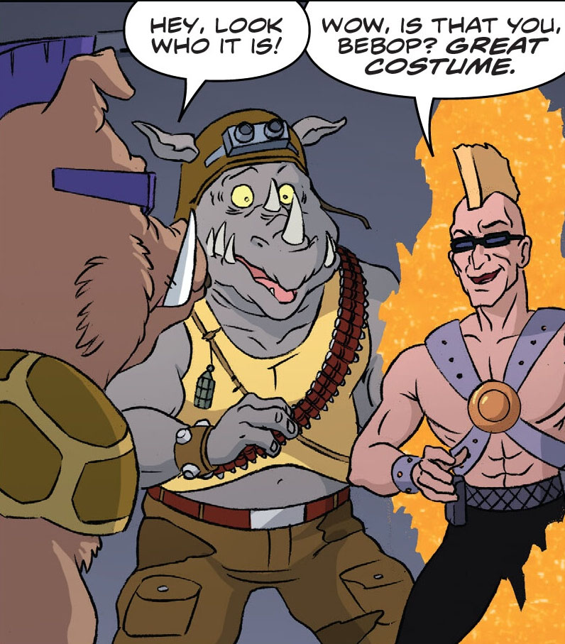 - Renet dit ne pas vouloir précipiter les choses en expliquant sa venue aux tortues avant de disparaître. Elles termineraient avec des narines et une queue. Les narines sont une référence au design des deux films Ninja Turtles sortis en 2014 et 2016 par la Paramount et très moqués des fans.