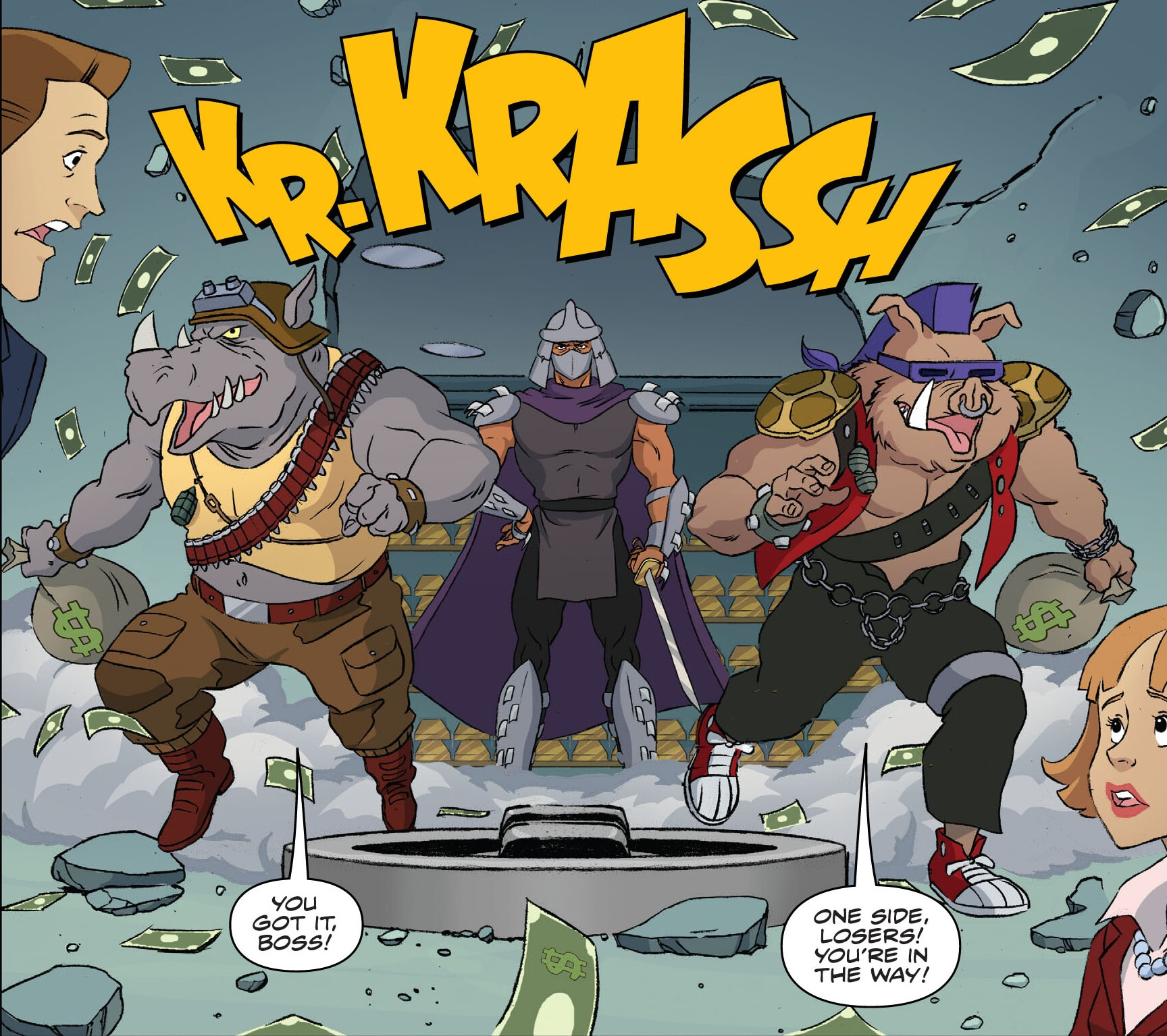 Avec ces informations bien notées, Shredder ouvrait un portail. Nul besoin de voyager dans le temps, il comptait simplement prendre quelques billets dans le coffre-fort d’une banque. Bebop et Rocksteady l’accompagnaient. Une fois les bras chargés de sacs, ils essayaient de repartir par le même portail, qui venait de disparaître sous leur nez. Shredder essayait d’en faire un second, mais la lame était déjà épuisée. Il regrettait que cette nouvelle arme ne soit pas aussi puissance que l’Épée de nulle part. Les deux mutants devraient fracturer la porte du coffre-fort à l’ancienne manière. Celle-ci volait en éclat, affolant tous les clients et les employés présents dans la banque. Une fois à l’extérieur, les trois malfrats tombaient sur les tortues, qui sautaient des toits pour les appréhender.