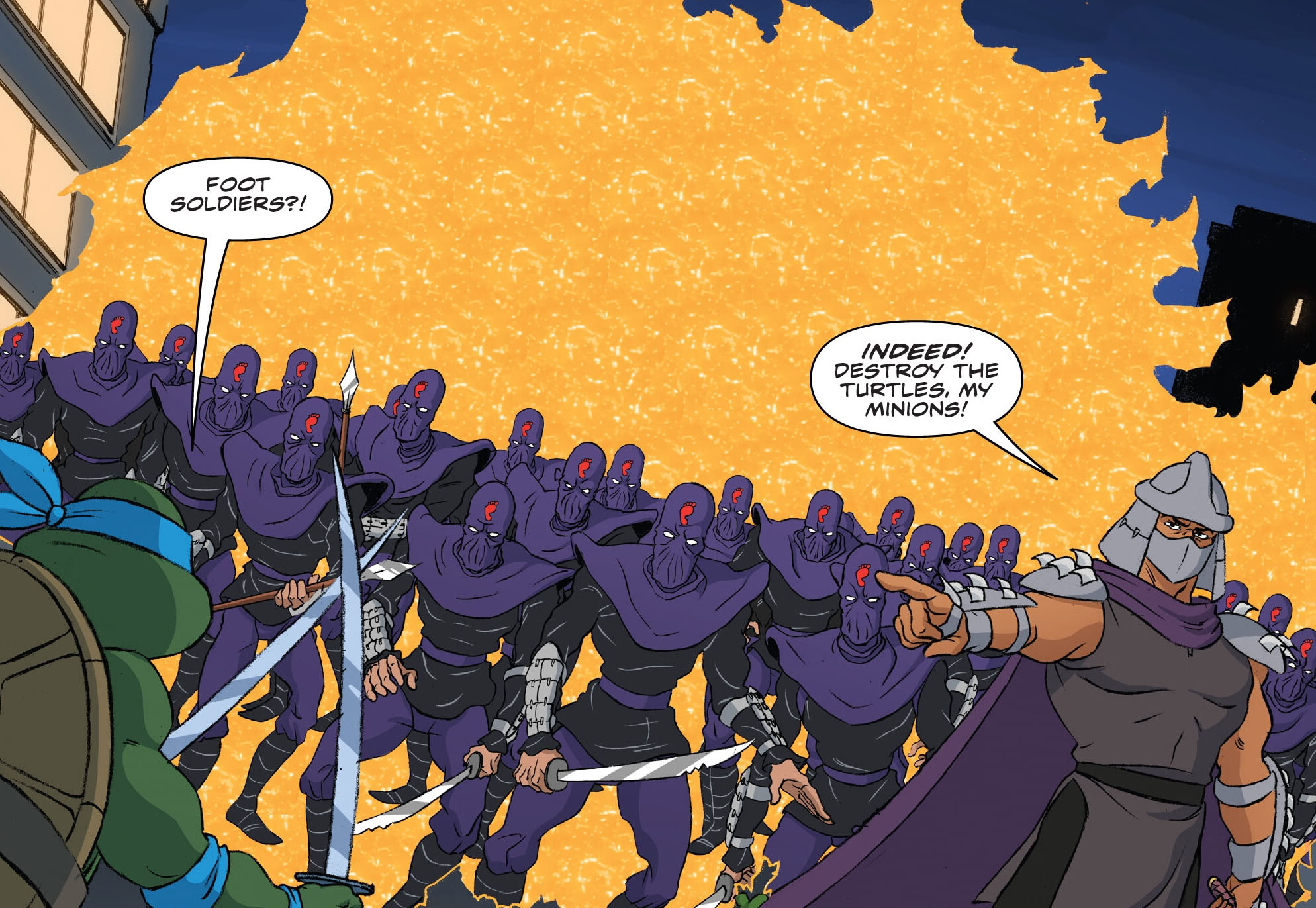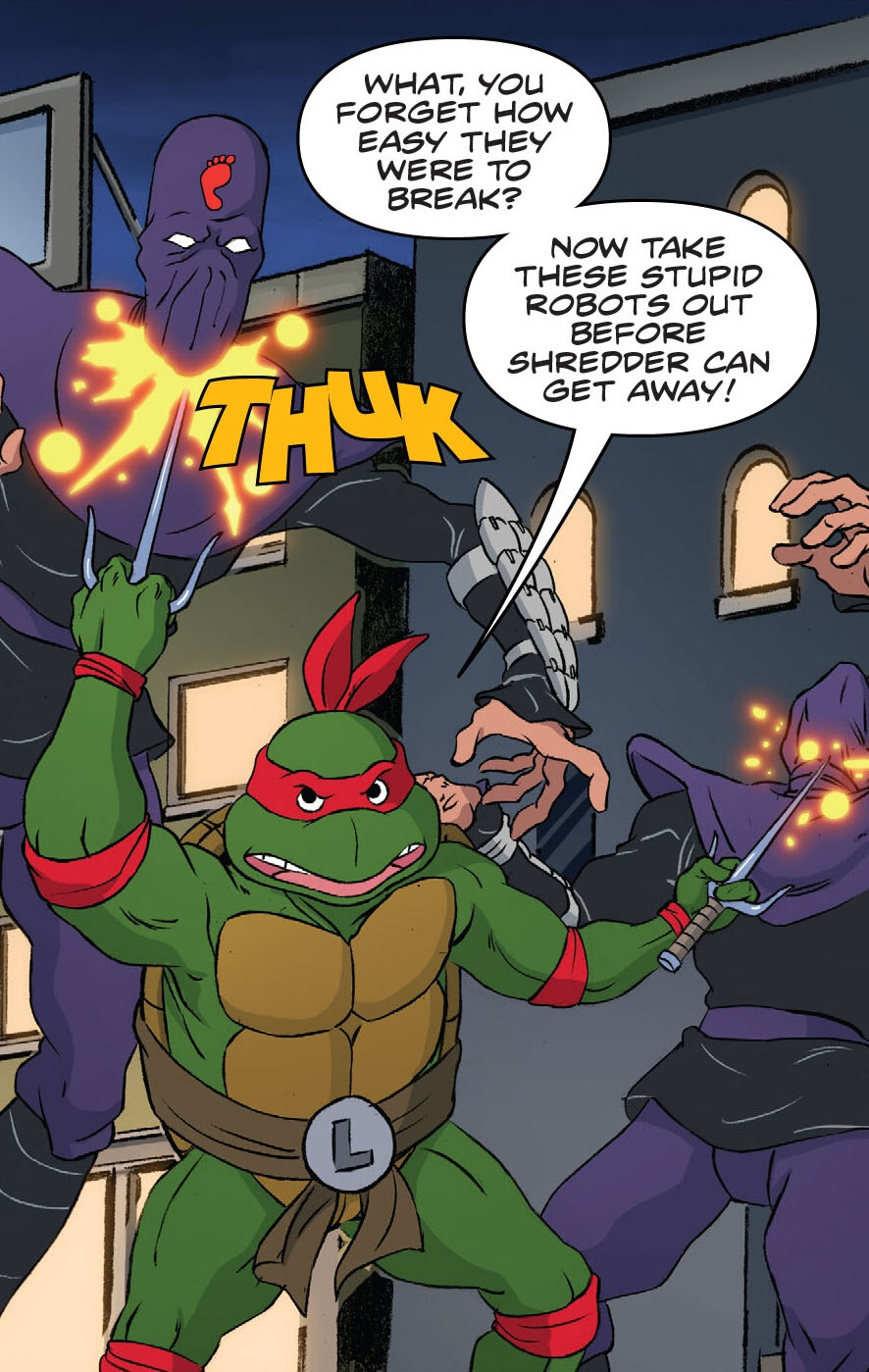 La situation devenant désespérée, Leonardo voulait tenter le tout pour le tout et tester la botte secrète de Splinter. Certes Shredder était un ninja expérimenté. Mais il n’avait pas d’autres solutions. Le mutant s’attaquait au sabre de son ennemi, qui volait en éclat. Surpris, Shredder disparaissait dans un halo orangé. Tout comme la tortue. Il ne restait plus dans la rue que les trois autres frères et un puzzle de centaines de morceaux de Foot soldiers. Bebop et Rocksteady avaient pris la fuite avec l’argent. Et la police arrivait bientôt. Les sirènes se faisaient entendre au loin…