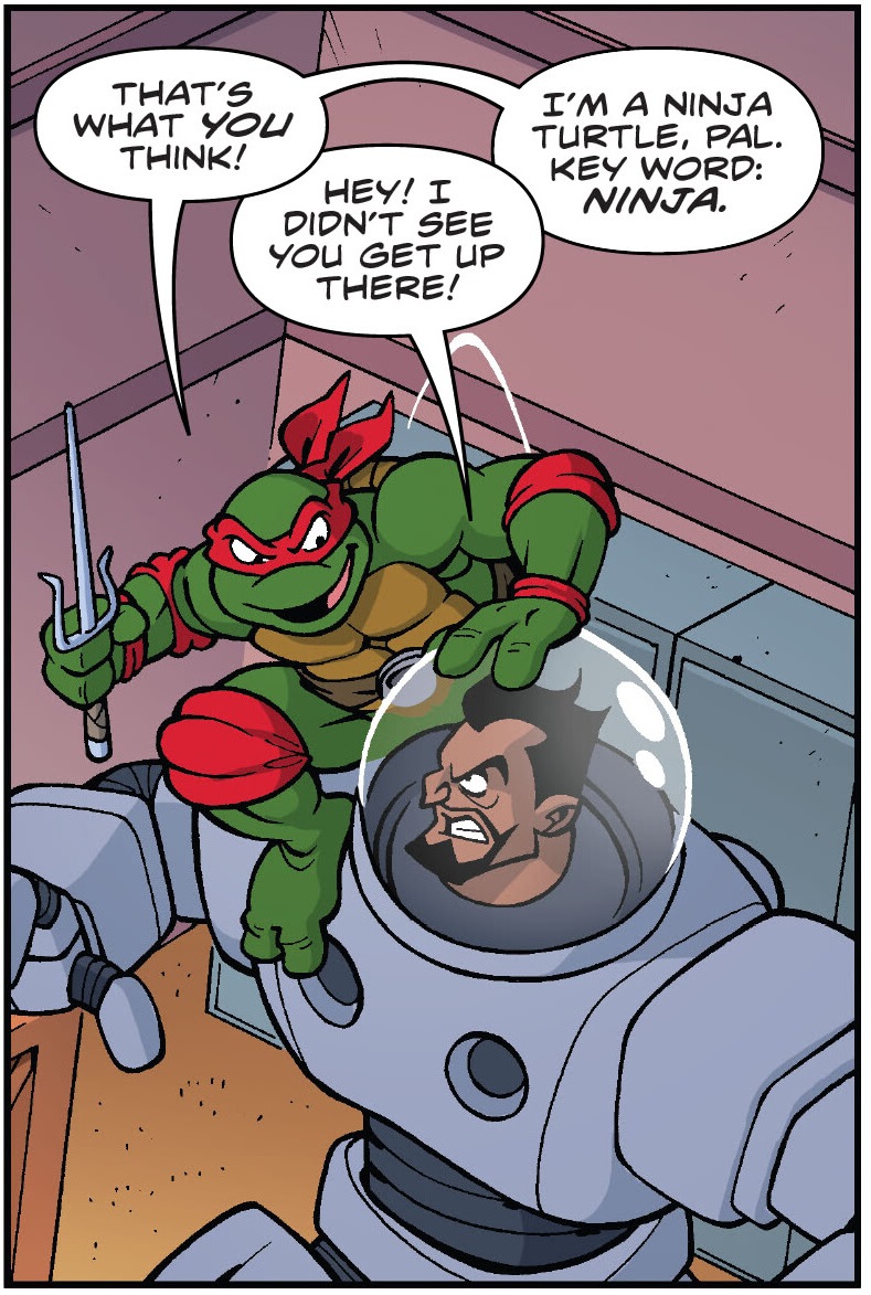 Dans l’appartement en contrebas, elles retrouvaient le mafieux et ses hommes en train de parler de leur prochain plan. Sans plus tarder, les mutants sautaient sur eux par surprise. Les sbires étaient neutralisés. Turtellini s’empressait de revêtir une armure cybernétique et tirait sur les trois mutants. Mona Lisa lui sautait dessus, forte de ses entraînements aux arts martiaux avec ses amis à carapace. En vain, elle était projetée au sol. Raphael prenait la suite, surprenant son adversaire. De son saï, il frappait la boîte de conserve jusqu’à se faire éjecter de son épaule. La salamandre, qui se relevait, apercevait un trou dans l’armure de métal. La batterie de celle-ci était apparente, ce qui lui donnait une idée. Michelangelo, qui gisait au sol, faisait distraction. Mona Lisa subtilisait la batterie, ce qui empêchait Turtellini de bouger. Le combat était terminé.