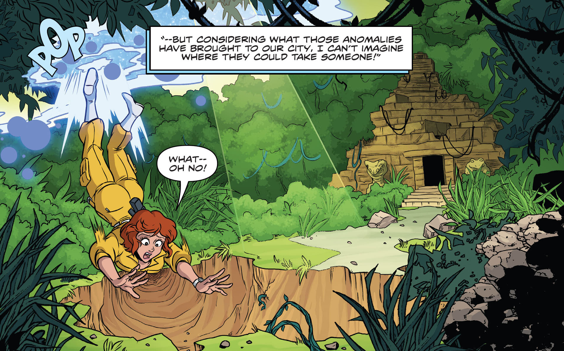Voilà déjà plusieurs jours que des anomalies spatio-temporelles s’ouvraient, laissant apparaître des dinosaures vêtus en anciens présidents américains ou encore en cowboys en plein Manhattan. Tout cela était dû aux distorsions créées par l’épée de Shredder (SMA #11). Face à ces troubles déconcertants, April interviewait le professeur McGuffin, qui ne savait pas trop expliquer ces anomalies. En revanche, il était clair qu’elles étaient de moins en moins longues sur la durée, commençant par plusieurs jours, puis devenant petit à petit plus courtes, quelques heures tout au plus. Le phénomène touchait-il à sa fin ? Alors que l’entrevue se terminait, un halo frappait le professeur, qui se faisait repousser de justesse par April. La journaliste était touchée à sa place. Vernon et Irma, qui filmaient pour la chaîne, ne comprenaient pas ce qu’il s’était passé…