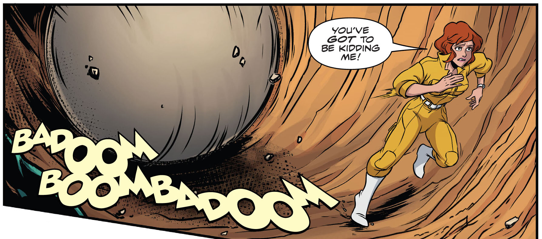 April apparaissait dans une jungle tropicale. Non loin se trouvait un temple, enfoui sous la végétation. La jeune femme se retrouvait dans une fosse dont le sol se mettait à trembler. Dans son dos, une immense pierre sphérique dévalait la pente en sa direction. La journaliste prenait ses jambes à son coup, mais sa route était barrée par un fossé dans lequel elle tombait.