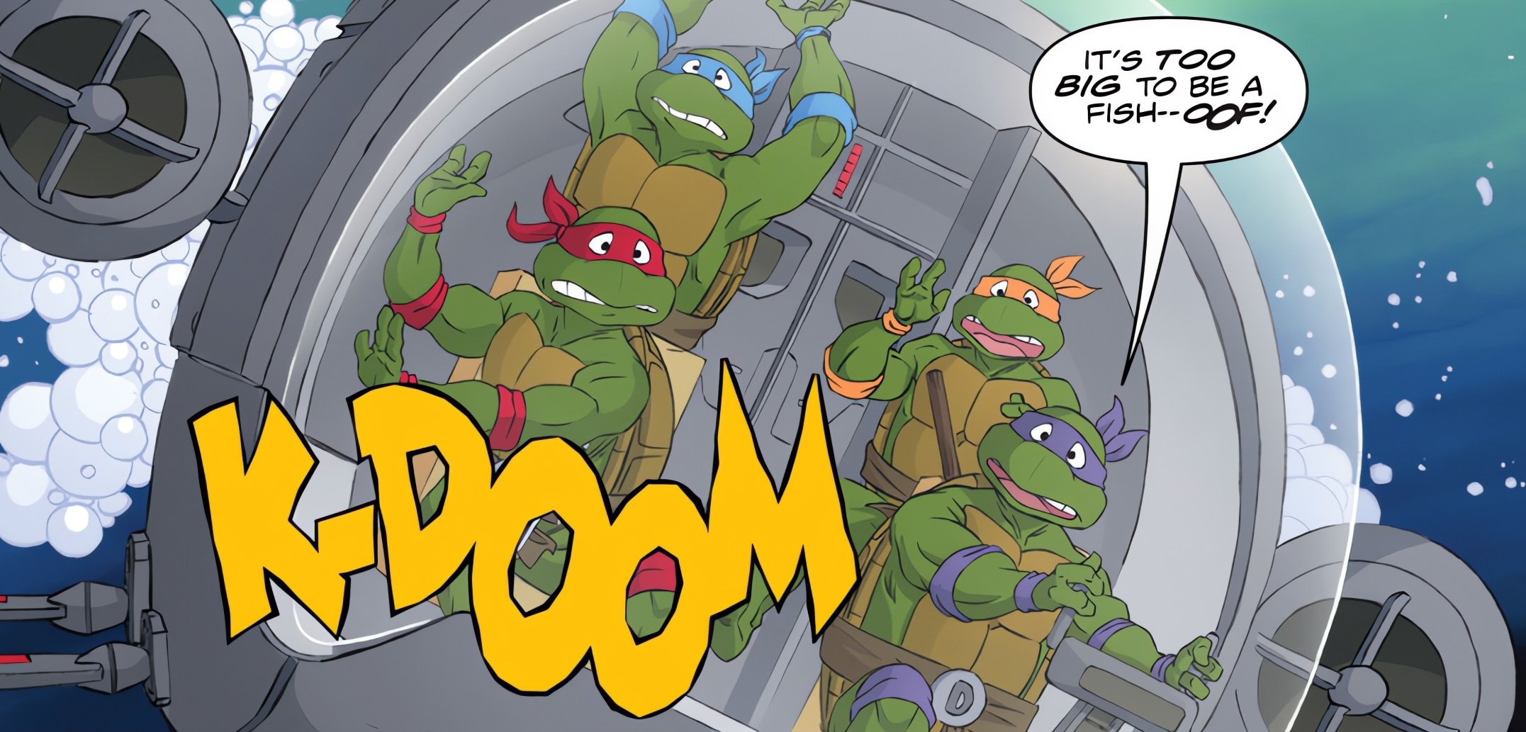 Les tortues étaient parties à bord d’un sous-marin du T.C.R.I. Tout cela car le professeur McGuffin avait perdu une sonde qui devait explorer les fonds marins. C’était une manière pour les ninjas de se racheter après les vols dans les laboratoires (SMAC #1 et SMAC #2). Et Donatello était bien curieux de savoir ce qui avait causé la perte de l’appareil.
