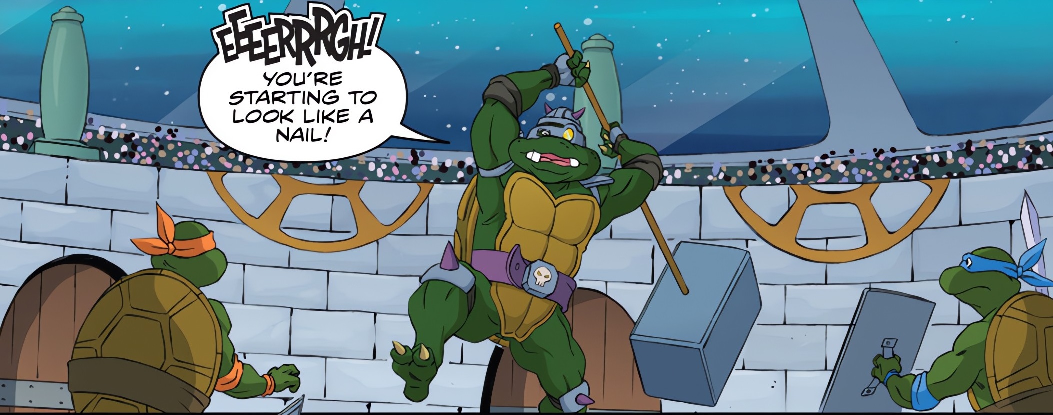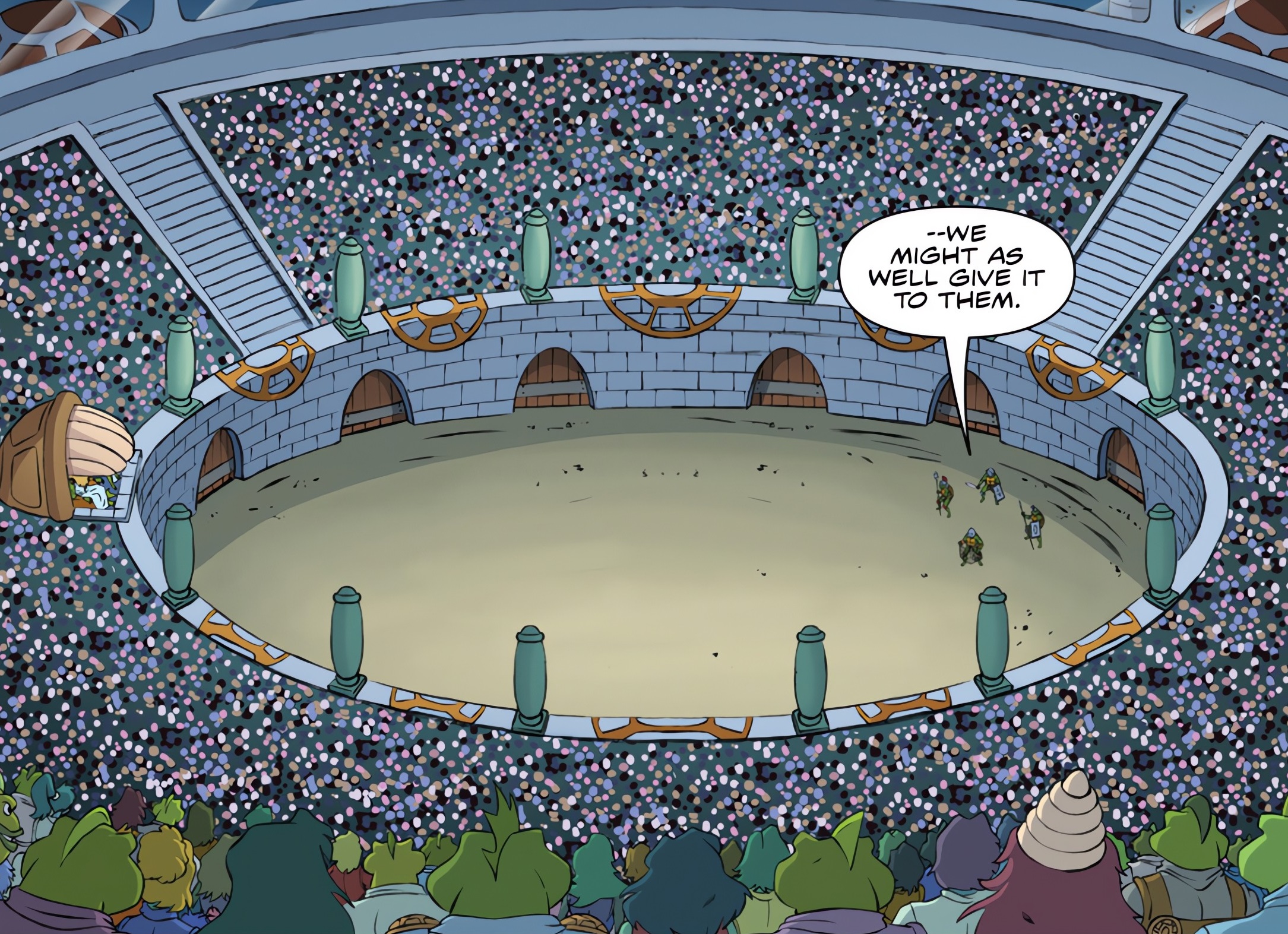 Donatello sautait sur le parapet en direction de la loge royale. Il se demandait si le peuple de Turtlantis pouvait respirer sous l’eau. Le roi acquiesçait. La réponse était parfaite. Le ninja proposait de détruire le dôme de verre au-dessus de l’arène pour la noyer dans l’eau. Slash se lancerait à la poursuite des tortues, qui regagneraient la surface. Ainsi, le peuple pourrait se séparer de l’indésirable champion. La reine Kallista, toujours très calme et réfléchie, proposait plutôt d’ouvrir les portes principales. Ce serait plus simple en tous points. Avant de repartir pour l’arène, le génie de l’équipe demandait au peuple de Turtlantis de quitter sa cité pour quelques semaines. Slash pouvait rester plusieurs heures sous l’eau. Mais pas aussi longtemps. Ainsi ils en seraient débarrassés.