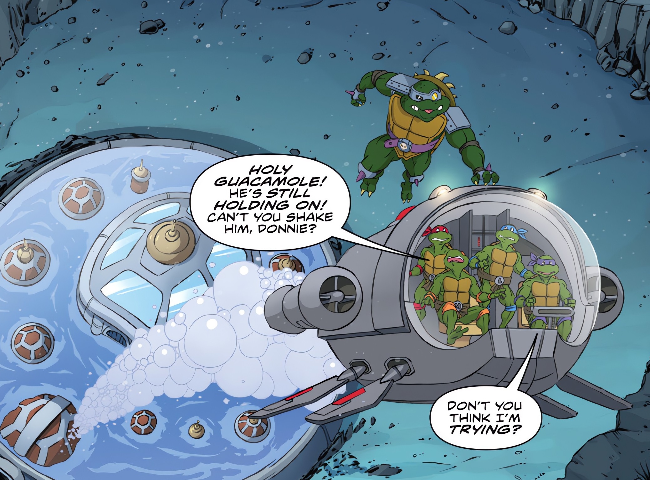 Donatello revenait vers ses frères, leur annonçant qu’ils repartaient en direction du sous-marin. Il fermait la porte du hangar derrière lui. Mais Slash, qui les suivait comme prévu, s’attachait à la détruire de sa force surprenante. Les tortues entraient en précipitation dans leur appareil, tandis que la pièce se remplissait d’eau. Au même moment, Slash détruisait la porte et se précipitait sur le sous-marin, qui gagnait la sortie de Turtlantis. Accroché à l’appareil, la terrible tortue commençait à la cabosser de ses poings. Les occupants commençaient à s’inquiétait de la résistance de la machine du T.C.R.I. Donatello, qui pilotait, essayait de lui faire faire des loopings. Finalement, leur poursuivant lâchait prise.