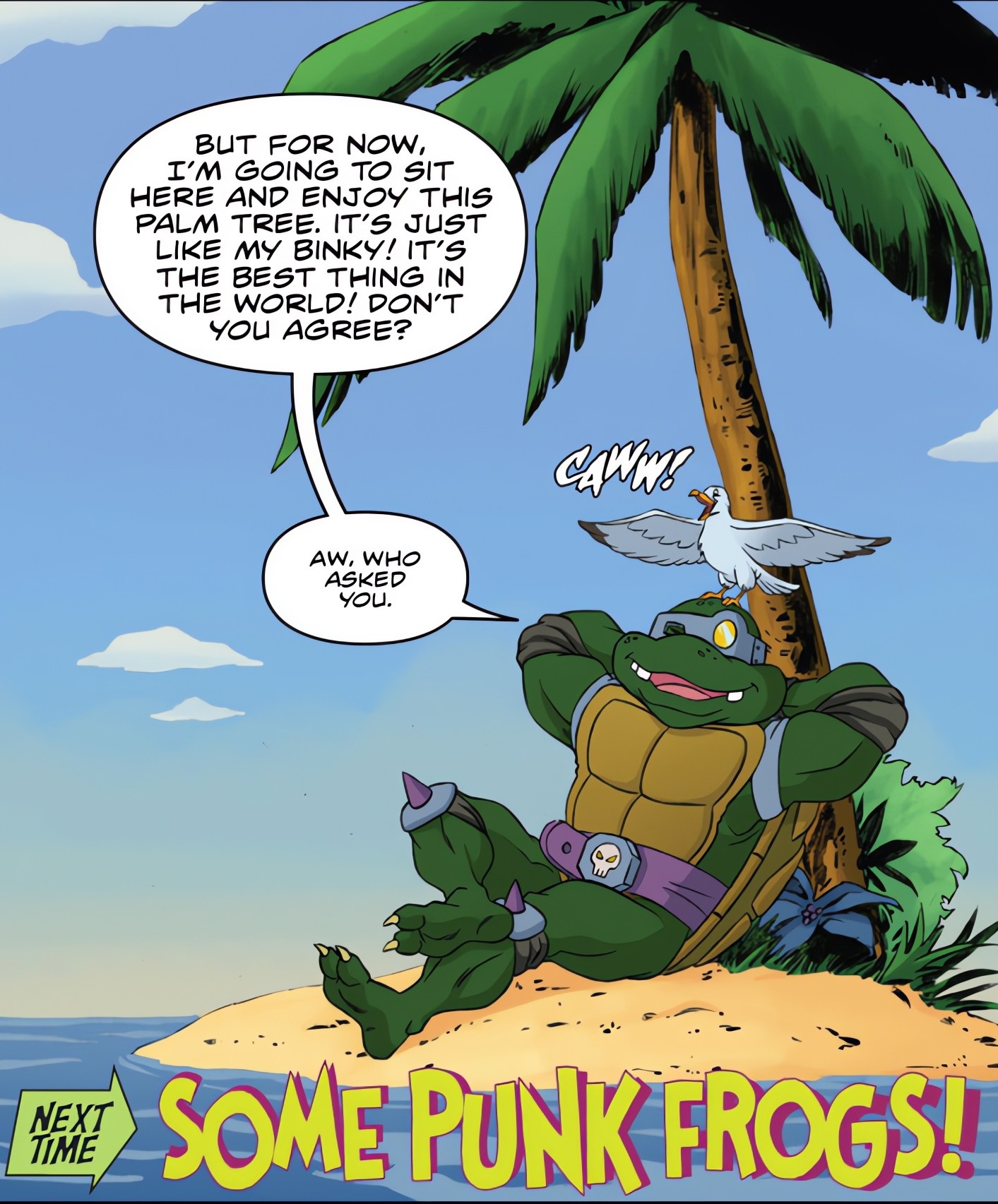 Et Slash dans tout ça ? La tortue avait regagné une toute petite île. Il se dorait la pilule sous un palmier. Son rêve devenait réalité !