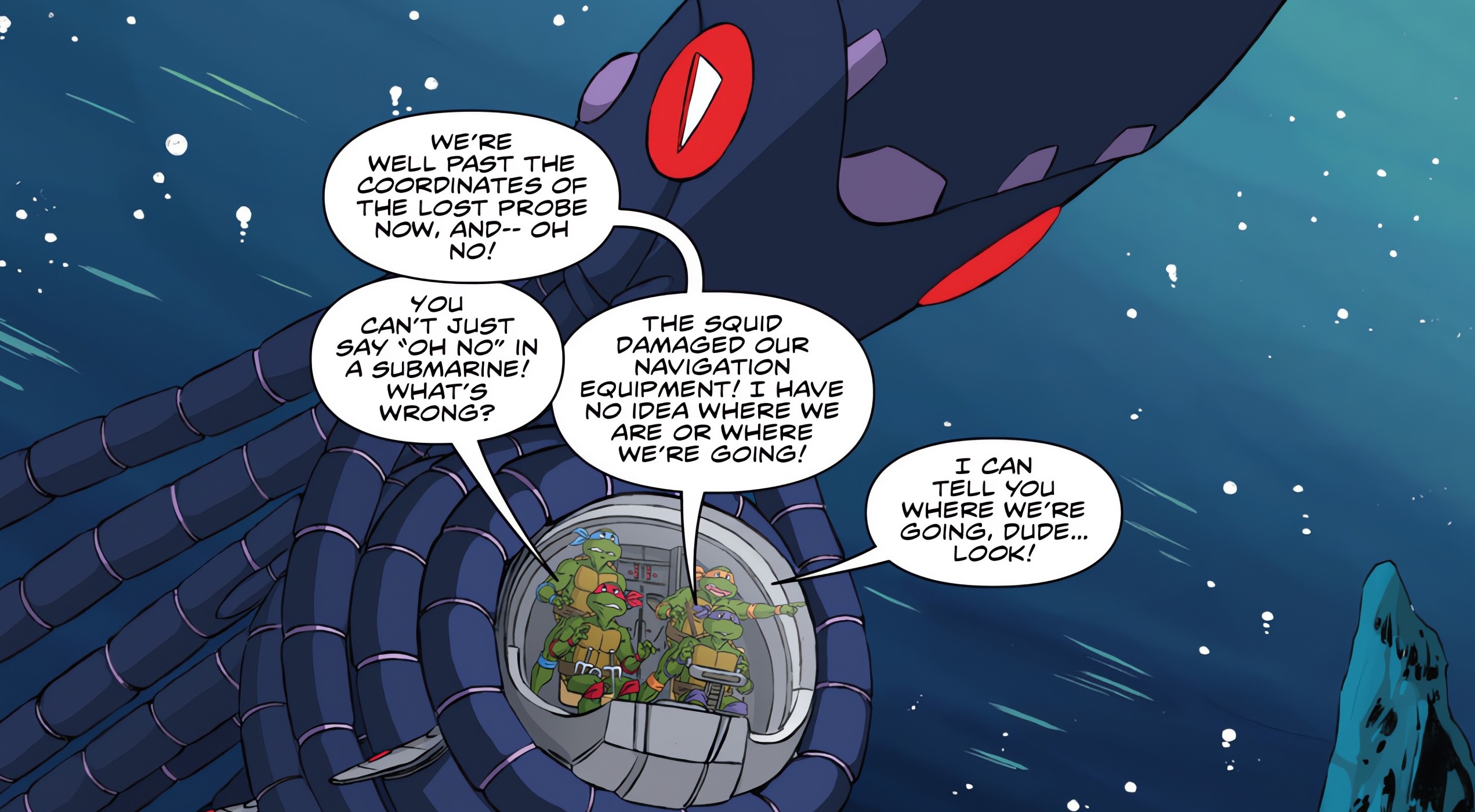 Mais une fois le danger écarté, Donatello se souvenait de leur mission initiale. Ils avaient oubliés la sonde… Impossible de retourner dans la cité, ils n’en connaissaient pas le chemin. L’état du sous-marin et les armures que les tortues portaient devraient prouver au professeur McGuffin qu’elles ne mentaient pas.
