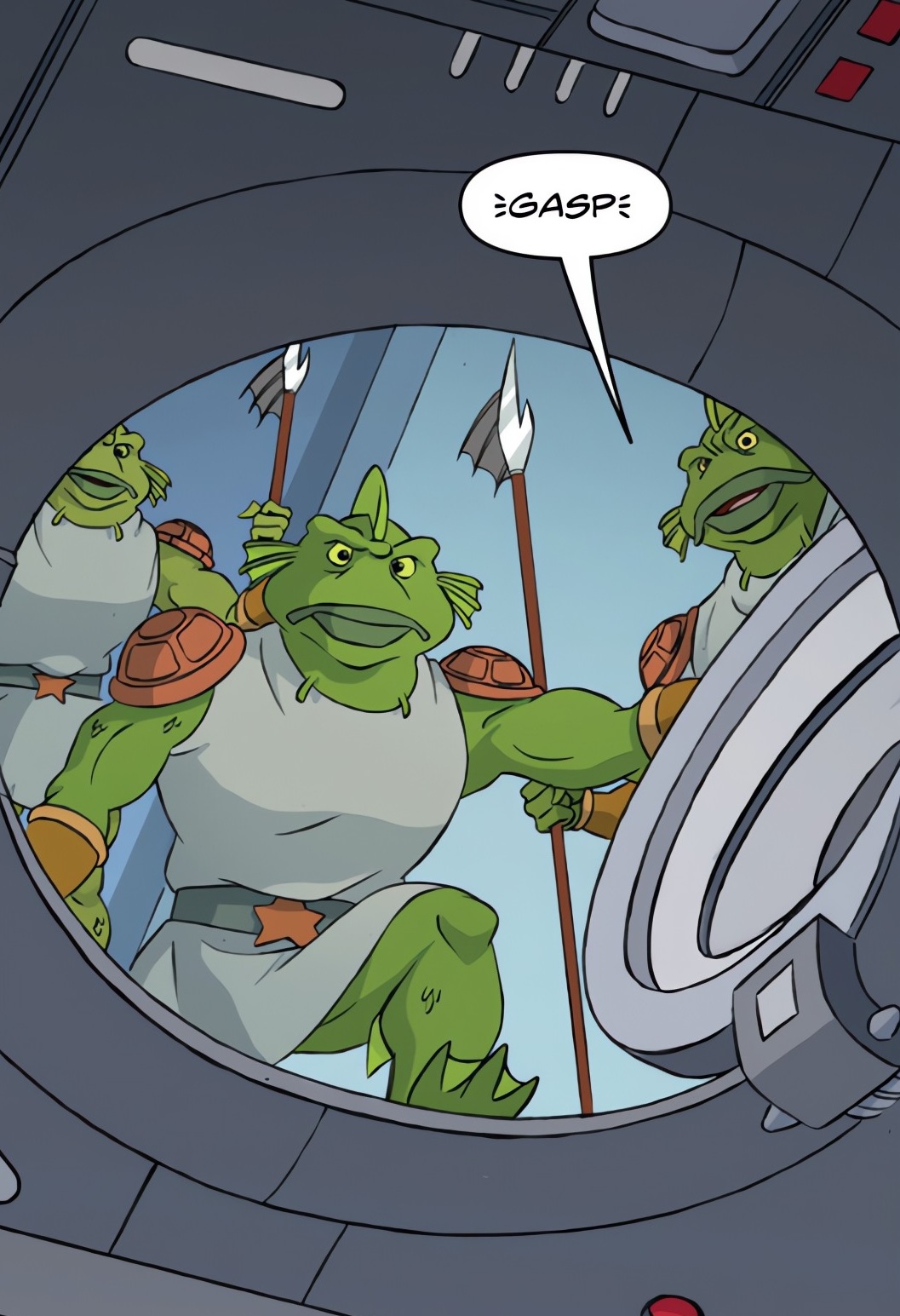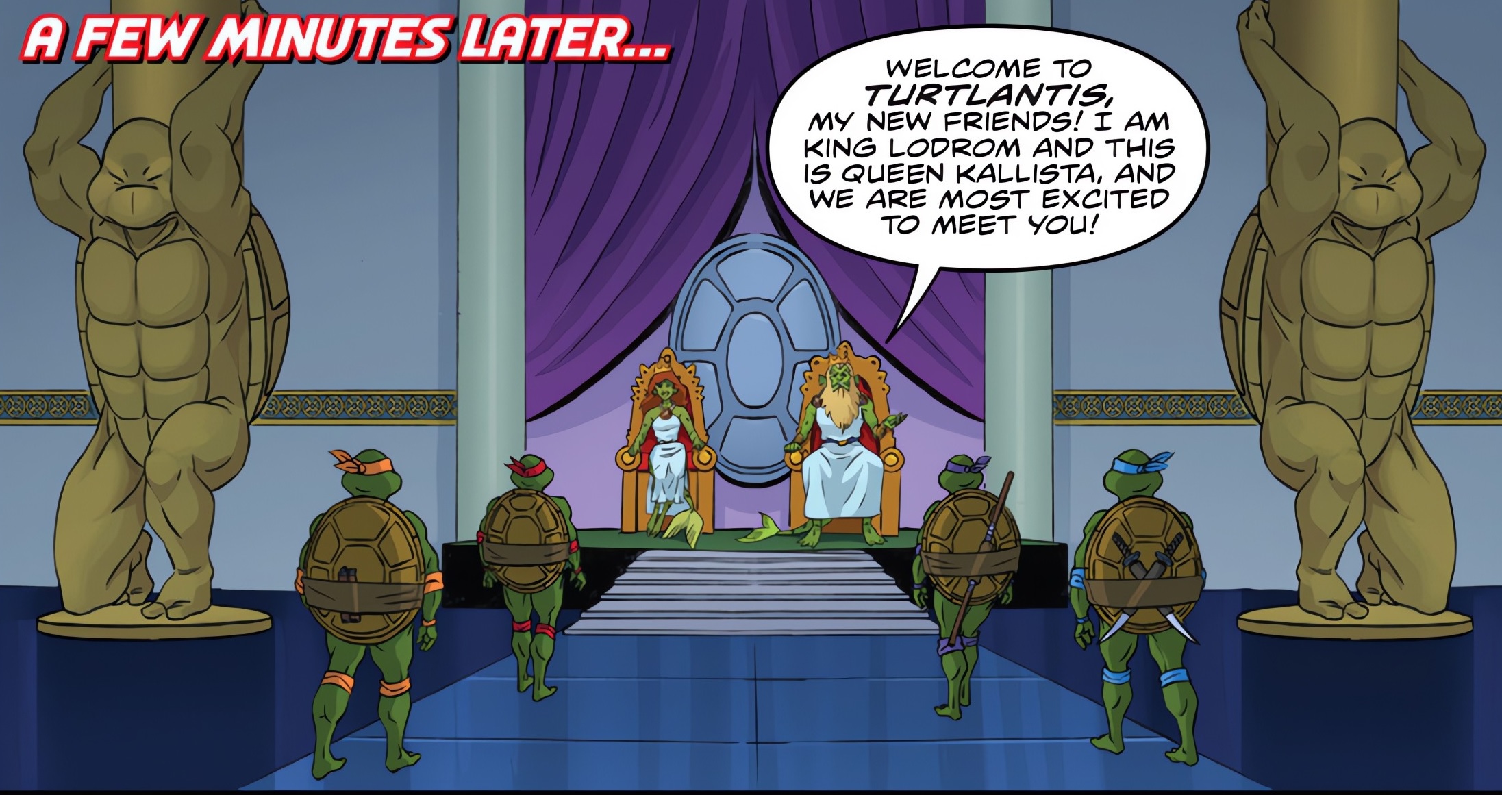 Sortant de l’appareil, les quatre frères étaient escortés par des gardes à l’allure de poissons, munis de lances. Leurs épaulettes étaient en forme de carapaces de tortue. Les reptiles parcouraient des couloirs, pénétrant dans un palais. Les intrus étaient conduits vers le roi Lodrom et sa reine Kallista, de Turtlantis. Leurs trônes se trouvaient entre deux colossaux piliers, soutenus par des atlantes en forme de tortues anthropomorphes. Le seigneur du lieu ne semblait pas surpris de voir les quatre ninjas arrivés, bien que ravi. Le culte rendu aux chéloniens était très fort en ce lieu. Les tortues faisaient immédiatement le lien avec le royaume de l’Atlantide. Mais le roi Lodrom tenait à rester bien clair à ce sujet. Ils n’avaient rien à voir avec le seigneur Alim Coelacanth, à qui il reprochait de trop vouloir les copier pour s’imposer.