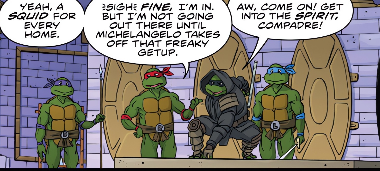- Michelangelo appelle Donatello « Donnie » pour la première fois. Le surnom plait beaucoup à la tortue. Généralement dans cet univers, son surnom était plutôt Don. Donnie a été introduit sous l’ère de Nickelodeon pour le dessin animé de 2012 (bien qu’il ait déjà été utilisé par le passé).