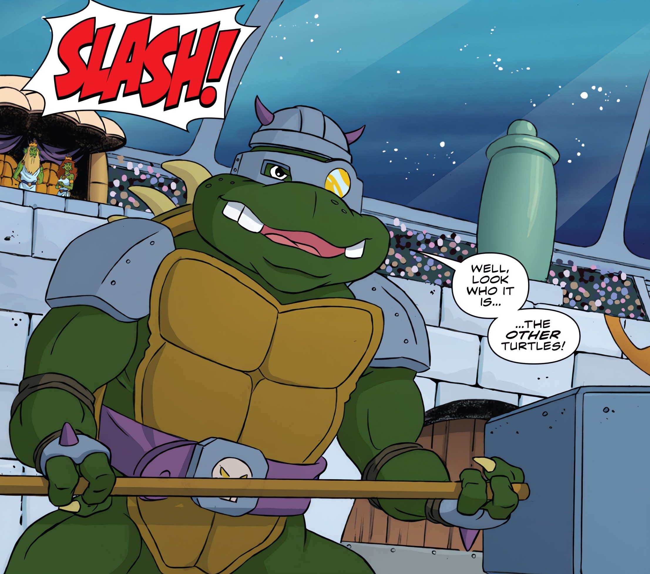 Le lieu était gigantesque. Telle une arène romaine traditionnelle du IIe siècle. Les tortues entraient sur la scène, armes en main. Le roi Lodrom, dans un coquillage, annonçait les jeux. Leur adversaire entrait lui aussi en piste. Les frères étaient désemparés. Ils comprenaient mieux pourquoi il n’était pas surpris de voir des tortues anthropomorphes en ce lieu. Elles devaient affronter Slash ! La tortue stupide maniait une énorme masse qu’elle s’empressait d’écraser vers ses rivaux. Le combat serait très rude. Les ninjas n’étaient d’ailleurs pas certains de l’emporter face à la force de la nature. Mais cela donnait une idée à Donatello, qui demandait à ses frères de tenir le coup tandis qu’il partait s’entretenir avec le roi.