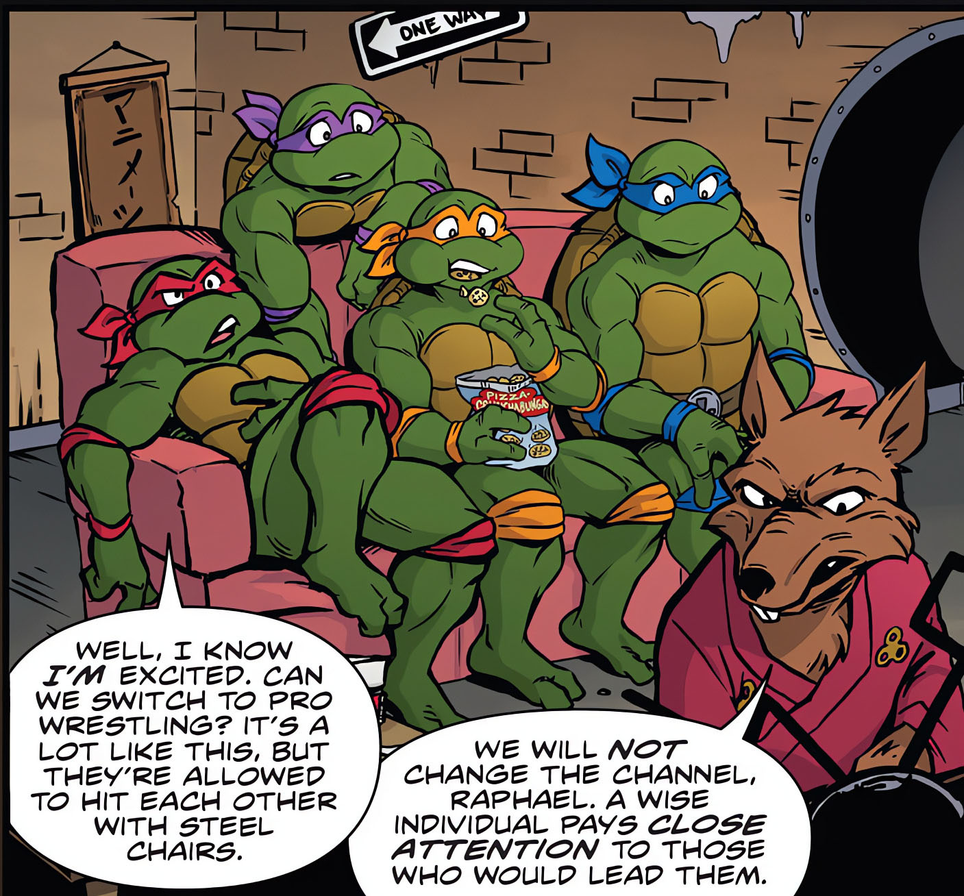 Pour une fois, les informations n’intéressaient pas les tortues. Malgré la présence d’April à l’antenne, elles préféraient changer de chaîne. La raison ? Un débat politique entre les candidats à la mairie de New York. Les quatre frères ne voyaient pas pourquoi ils devaient y prêter attention. Après tout, ils n’étaient que des adolescents sans droit de vote. Ni même la possibilité de voter une fois adultes. Cette position décevait terriblement Splinter, qui ne se gênait pas pour leur rappeler qu’ils avaient tout intérêt pour se sentir concernés. L’élection d’un individu pouvait changer leur vie, en bien comme en mal. Ils devaient se tenir prêts aux changements. Et donc suivre l’actualité politique.