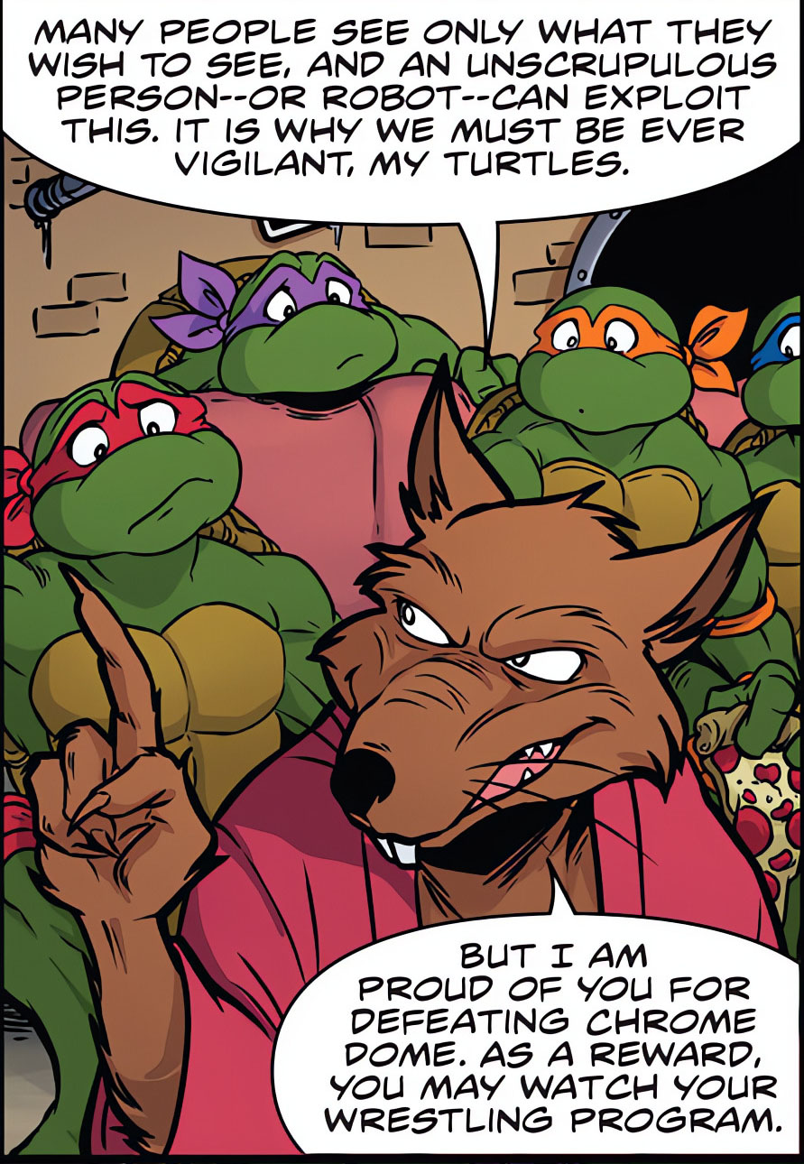 Une fois Chrome Dome parti, les quatre mutants relevaient le professeur, chamboulé. Il ne pensait pas à mal. On avait apporté la carcasse du robot au T.C.R.I. pour étude. Le curieux scientifique avait simplement tenu à le reprogrammer pour en faire un candidat et un maire idéal. Mais il avait encore un plan. La télécommande était détruite, mais pas la puce à l’intérieur. Il « suffisait » aux tortues de l’implanter dans les circuits du robot. Un autre problème se présentait aux ninjas. Ils ne pourraient pas attaquer une personnalité publique comme Chrome Dome. Les adolescents partaient s’entretenir avec April pour trouver une autre solution, par la voie de la légalité.