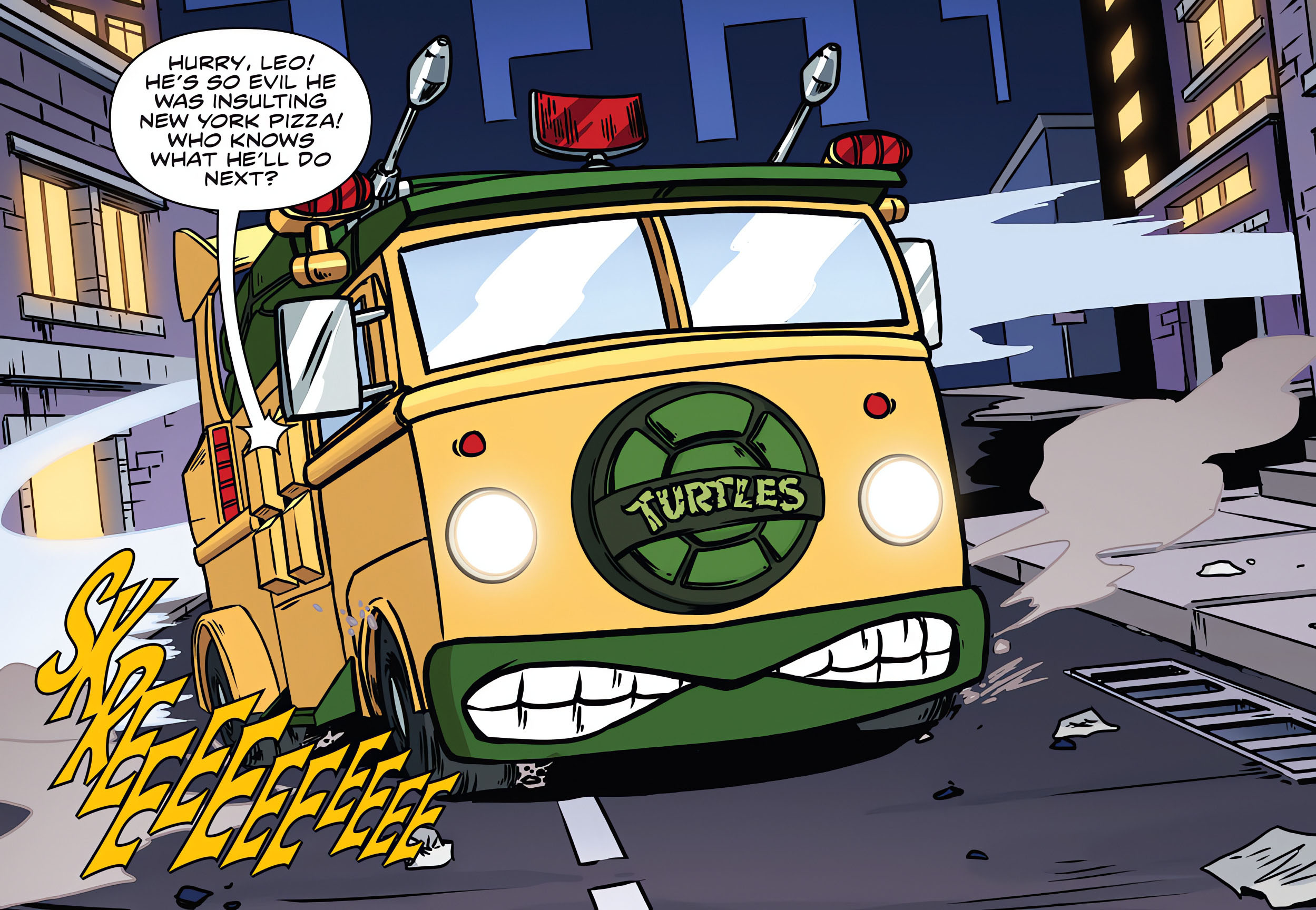 tortues entraient en scène, lui ordonnait de relâcher McGuffin. Chrome Dome s’exécutait avant de sortir de ses lasers et de tirer sur les ninjas. En vain, son artillerie ne fonctionnait plus. Il repoussait les assaillants tout en se disant qu’il n’aurait bientôt plus à se battre. Devenu maire, les forces de l’ordre seraient sous son contrôle. Elles traqueraient les tortues jusque dans leurs cachettes.