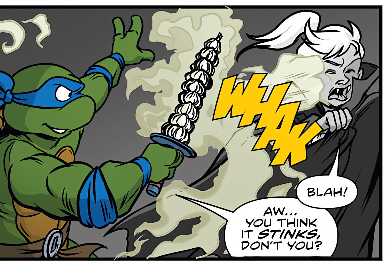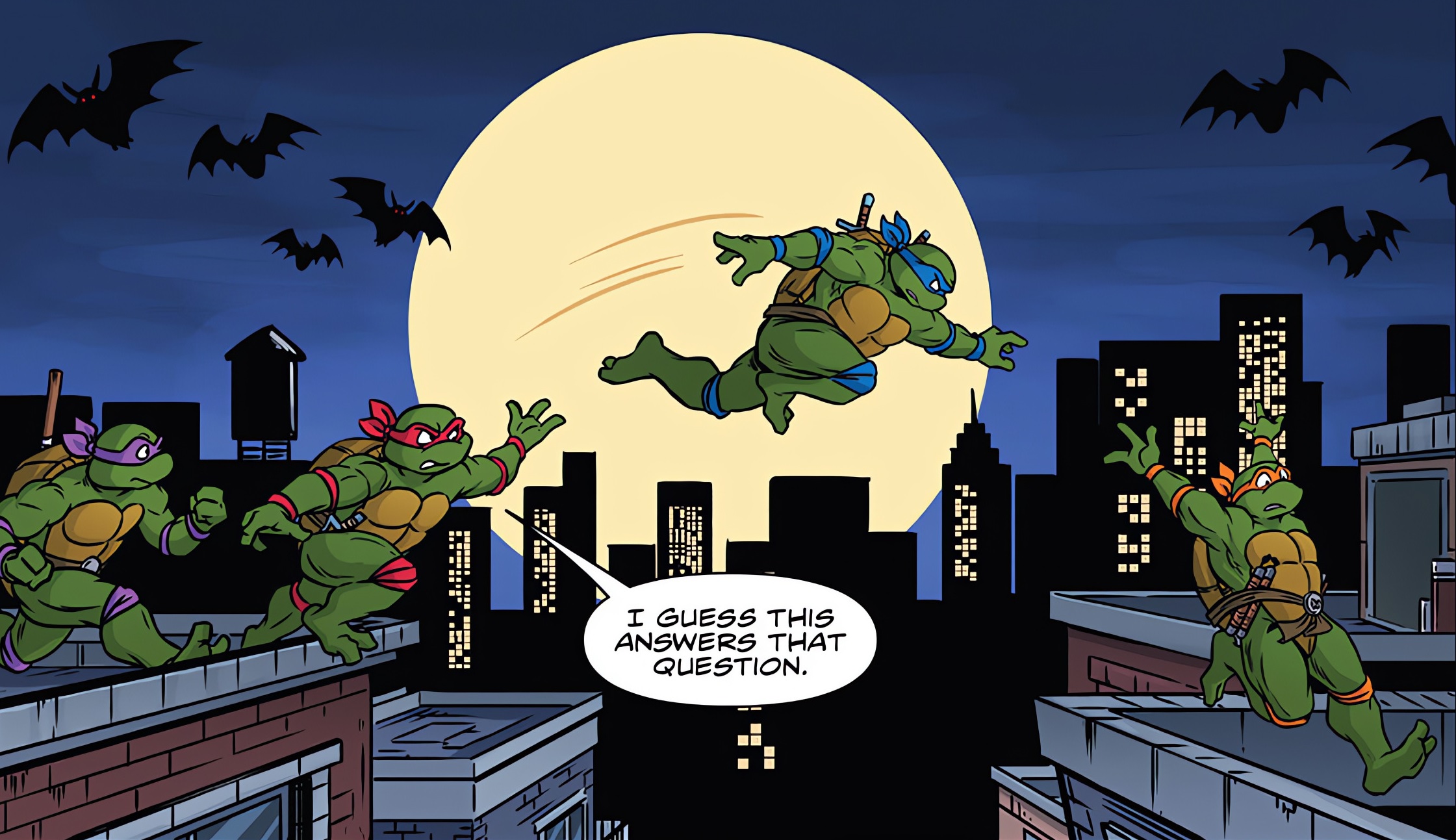 Michelangelo en avait assez de se battre et surtout ne comprenait pas pourquoi ils devaient constamment faire en fonction de l’imagination de Creepy Eddie, dans une dimension de rêve. Cela donnait une idée à Donatello, qui se rendait compte que si les lois de la physique qu’ils connaissaient s’appliquaient, ses frères et lui pouvaient aussi faire ce qu’ils voulaient ! Comme dans un rêve. Sans attendre, Michelangelo provoquait une bourrasque glaciale de ses nunchakus sur le monstre à la tronçonneuse. Raphael faisait apparaître un levier pour activer une trappe sous les pieds de la momie, comme dans un dessin animé. Leonardo transformait les lames de ses sabres en gousses d’ails pour repousser le vampire. Enfin, Donatello défiait les lois de la physique en frappant le loup garou. Vaincu, Frankenturtle s’enfuyait de son château.