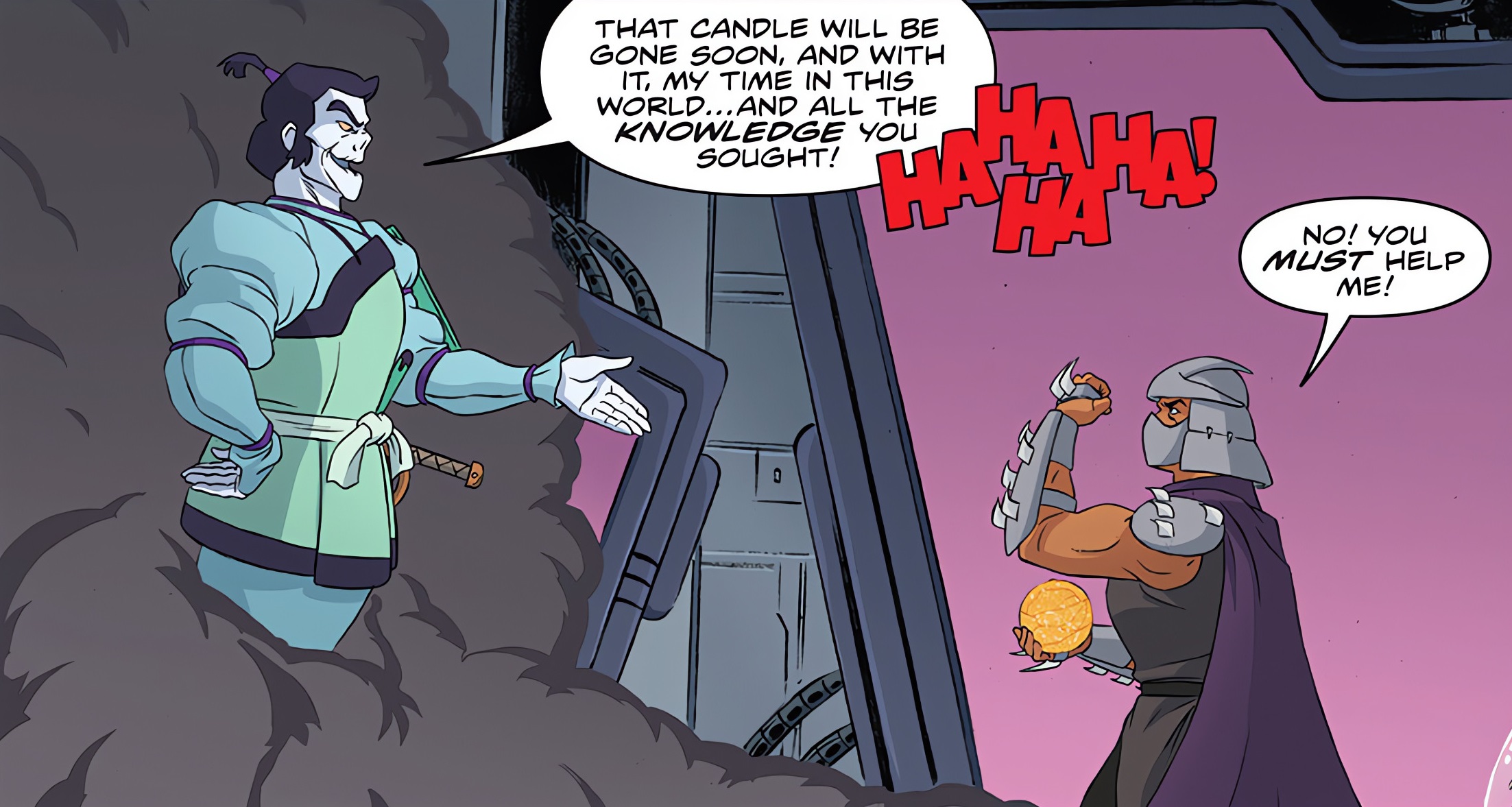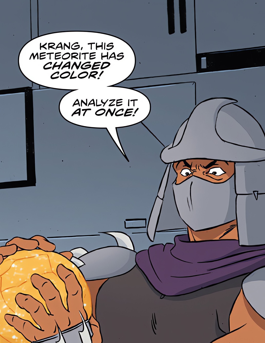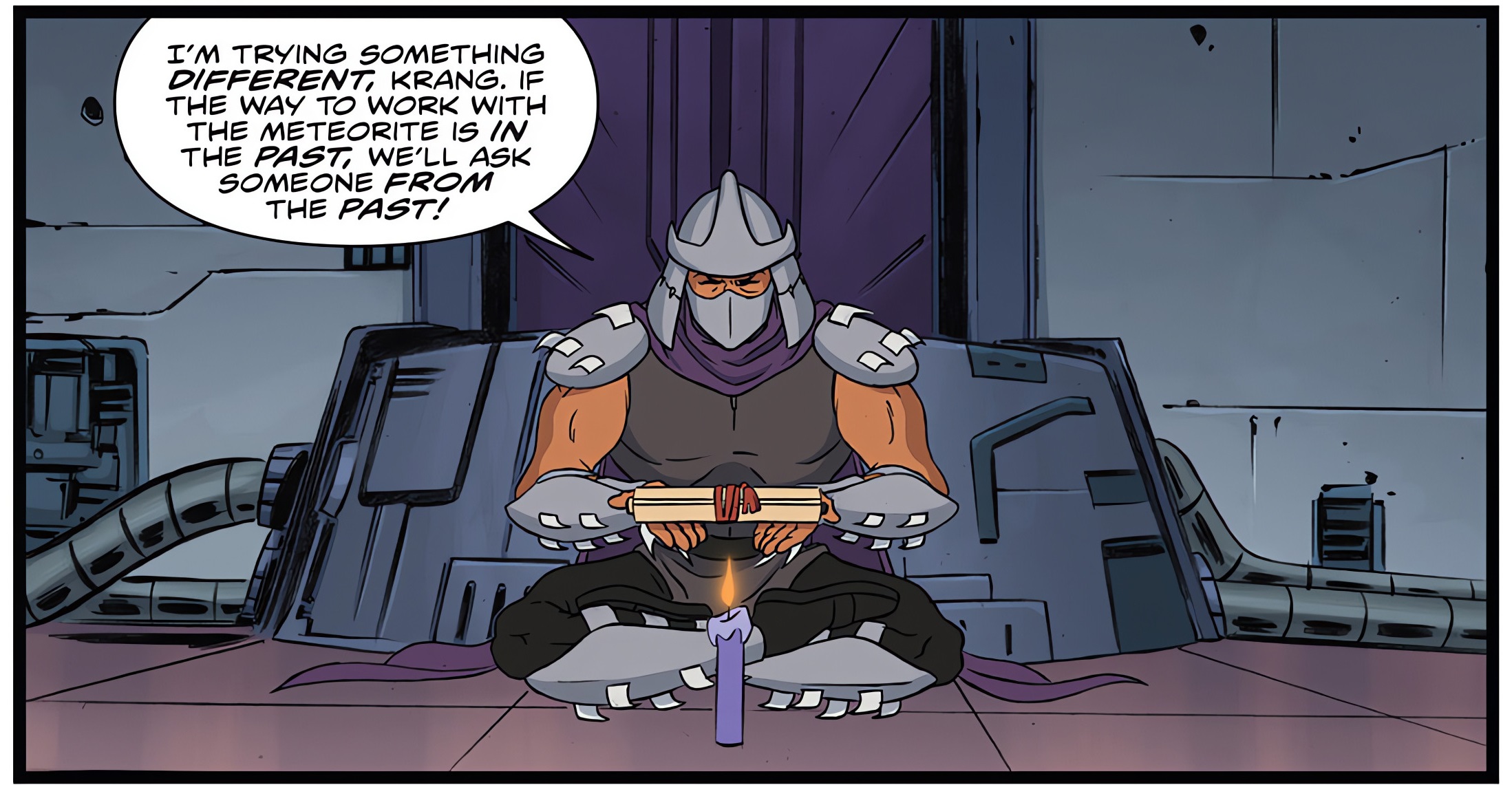 Pendant ce temps, Krang continuait de chercher un moyen de couper la météorite pour exploiter l’alliage extraterrestre (SMA #2). La créature rosâtre désespérait à l’idée de trouver une solution. Ils avaient déjà perdus beaucoup trop de temps là-dessus (SMA #4). Entrait alors Shredder dans la pièce. L’homme posait une bougie au sol et s’asseyait, un parchemin entre les mains. Il s’apprêtait à invoquer une entité de l’au-delà, puisque la technologie de la Dimension X ne fonctionnait pas. Krang devenait fou, à chaque fois que son acolyte convoquait un esprit, cela tournait mal !