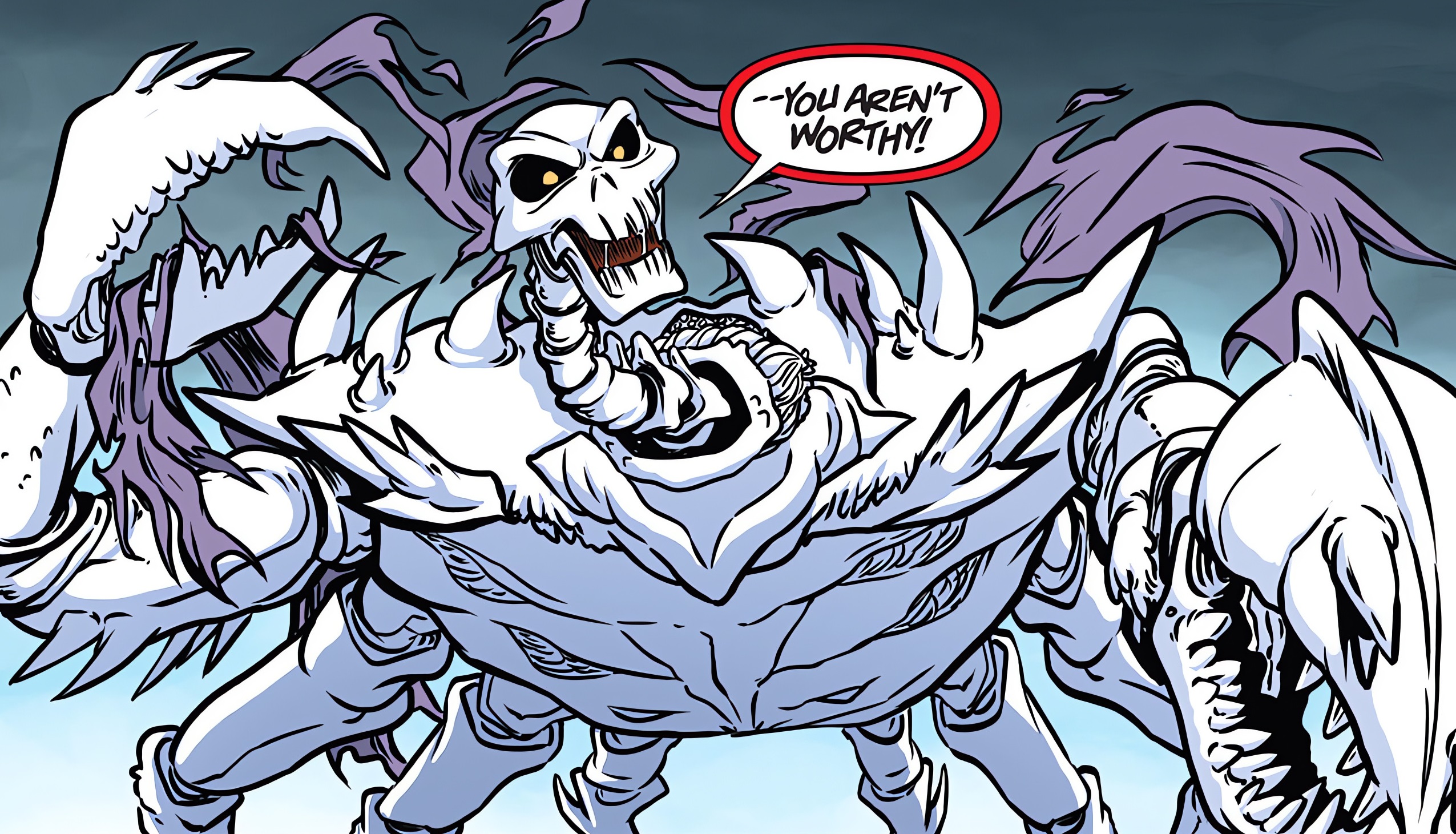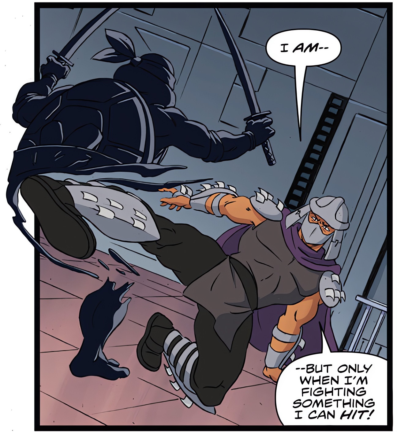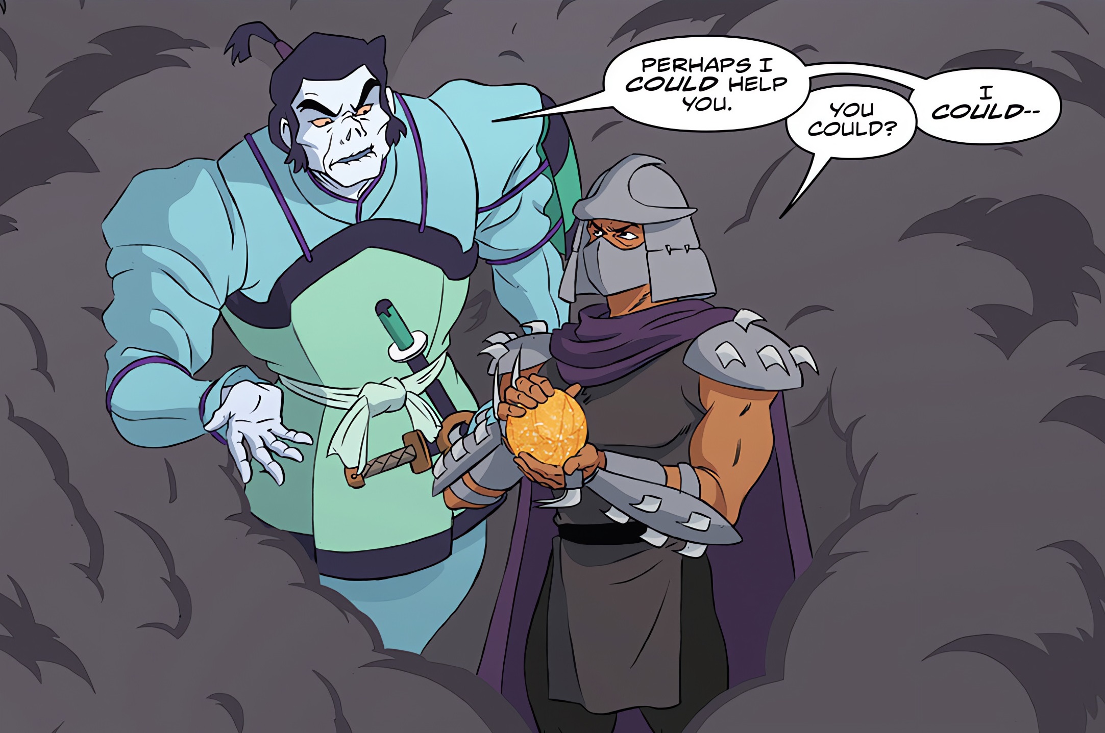 Pendant ce temps, Krang continuait de chercher un moyen de couper la météorite pour exploiter l’alliage extraterrestre (SMA #2). La créature rosâtre désespérait à l’idée de trouver une solution. Ils avaient déjà perdus beaucoup trop de temps là-dessus (SMA #4). Entrait alors Shredder dans la pièce. L’homme posait une bougie au sol et s’asseyait, un parchemin entre les mains. Il s’apprêtait à invoquer une entité de l’au-delà, puisque la technologie de la Dimension X ne fonctionnait pas. Krang devenait fou, à chaque fois que son acolyte convoquait un esprit, cela tournait mal !