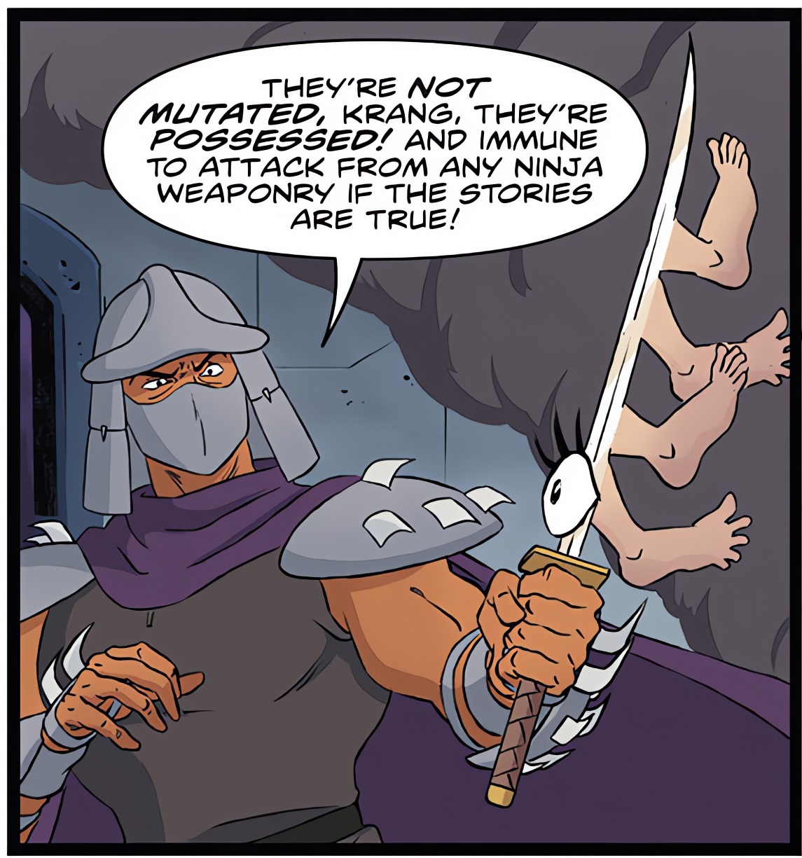 Énervé, il transformait les objets dans la pièce, leur donnant vie. Krang désespérait de voir Shredder s’entêter dans ses erreurs face aux spectres. Surtout que son frigo contenait ses yaourts préférés ! Mais son acolyte restait de marbre. Il sortait de son dos son muta-rayon et tirait sur les objets pour leur rendre leur forme normale. Il prouvait ainsi sa capacité à rivaliser avec les talents du forgeron. Ce dernier allait revoir sa stratégie et matérialisait une tortue ninja entièrement noire. Cette fois, le muta-rayon ne