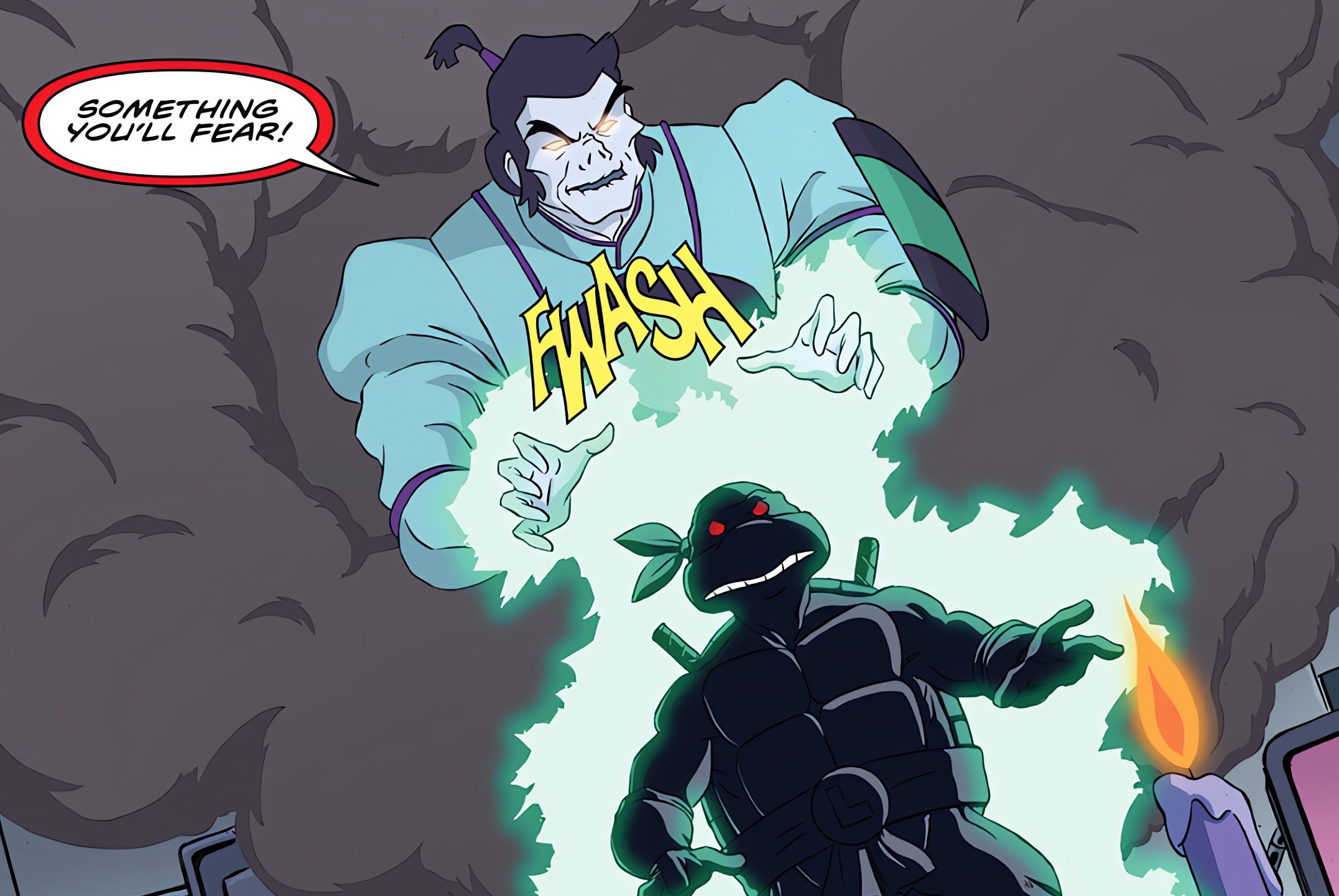 Le combat était terminé. Le fantôme était surpris de voir la puissance du minerai qui avait paré le coup de son invocation. Mais il n’avait pas l’intention d’aider Shredder dans sa quête pour autant. Il sentait qu’il s’agissait d’un être maléfique, raison pour laquelle il l’avait distrait le temps que la bougie qu’il avait allumée s’épuise. L’esprit disparaissait.