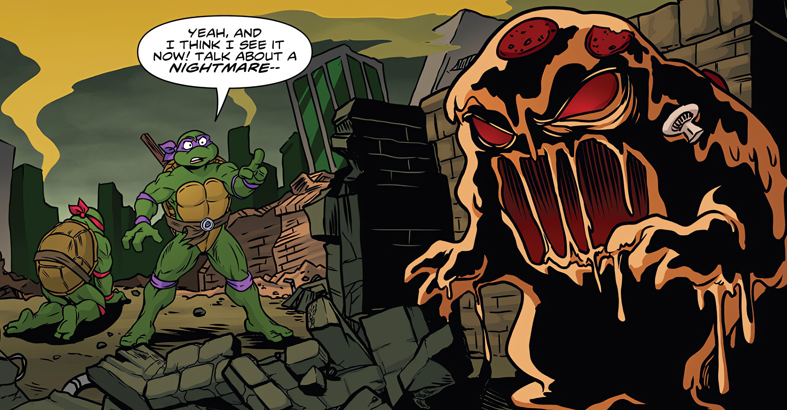 La chute ne les blessait pas, les tortues traversaient un portail pour tomber dans les ruines de New York. Une ville au décor post-apocalyptique où se cachait une terrifiante créature derrière les décombres. Un zombie fait de pizzas !