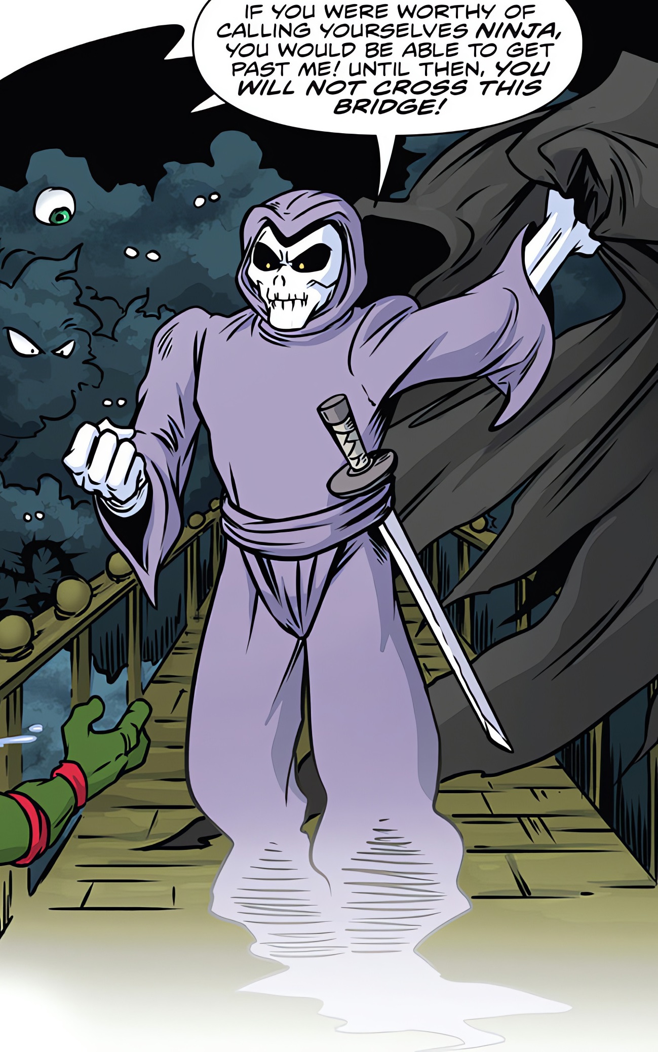 Arrivant dans des souterrains qui n’avaient guère l’aspect des égouts habituels. Mais au moins, les quatre frères retrouvaient le chemin de briques jaune, qui se poursuivait jusqu’à un pont. Bientôt, les tortues faisaient face à un être qui les empêchait de franchir la structure. Vêtu d’un long manteau noir et d’une voix caverneuse, il leur barrait la route. Levant son vêtement, l’individu laissait apparaître sa véritable forme. Il s’agissait de Shibano sama ! Impossible pour les tortues de venir à bout de ce nouvel esprit, qui les repoussait sans cesses. Leonardo y laissait même un de ses sabres. C’est alors que le spectre déchirait ses vêtements et grandissait, devenant un crustacé géant. Sans autre choix, les tortues prenaient la fuite face à ce monstre dément. Jusqu’à ce que Leonardo arrête son équipe, repensant aux mots de Splinter pendant qu’ils regardaient le film d’horreur. La peur ne les mènerait nulle part. Ils étaient suffisamment expérimentés pour surmonter ce monstre et poursuivre leur route. Les tortues revenaient vers Shibano et esquivaient ses pinces jusqu’à franchir le pont, dans son dos.