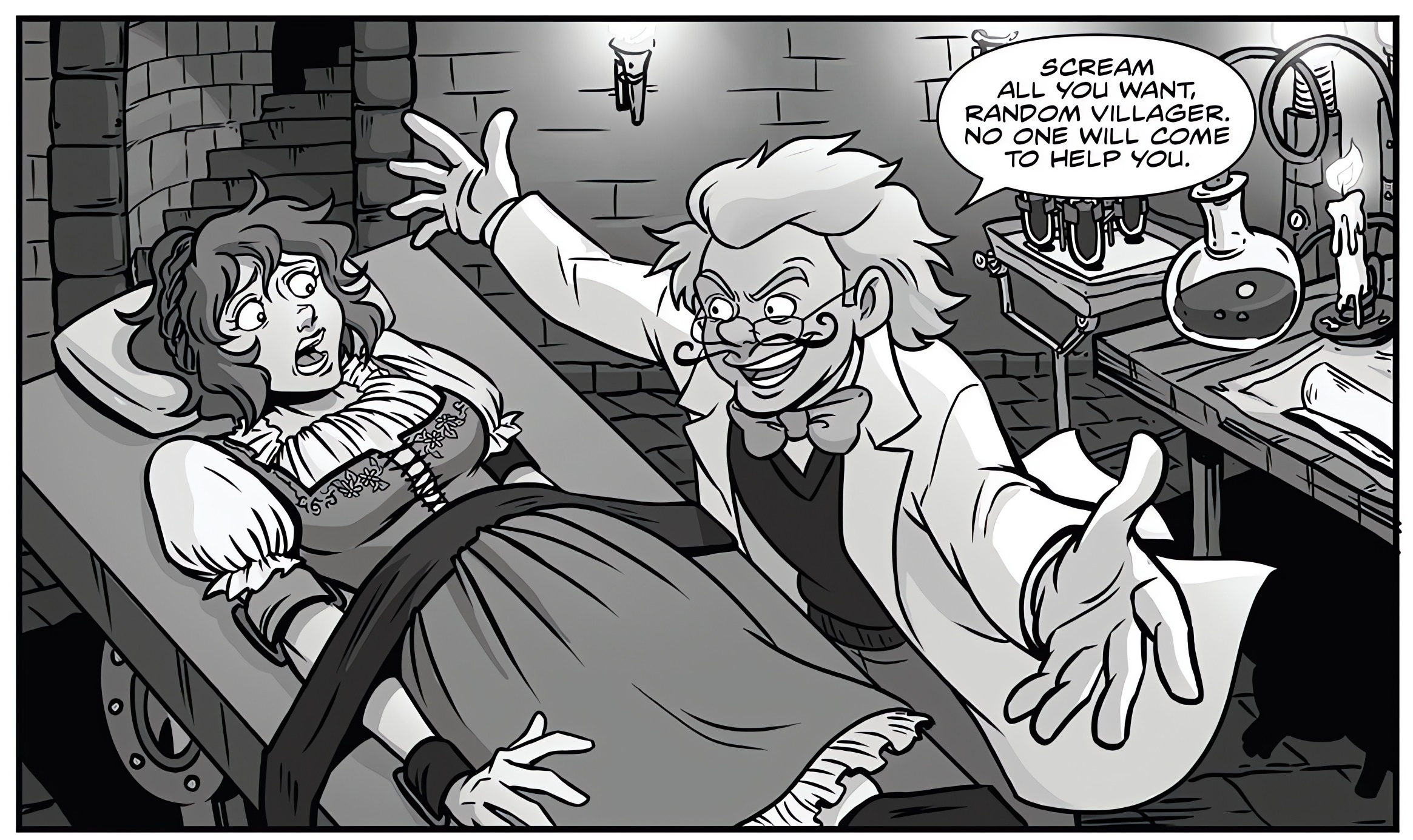 Les ninjas se rendaient dans un château au sommet d’un pic rocheux. À l’intérieur se trouvait le docteur Frankenturtle, prêt à faire des expériences sur la pauvre May, retenue solidement par des lanières sur une table d’opération. Les tortues entraient dans la pièce et reconnaissaient là une version humaine de Baxter Stockman, avec une moustache qui ne lui allait clairement pas. L’homme ne s’en faisait pas pour ses desseins. Ces intrus seraient repoussés sans mal. Il faisait venir ses monstres, un vampire, une momie, un loup garou, ainsi que le tueur à la tronçonneuse du film que regardaient les tortues avant que cette aventure ne commence.