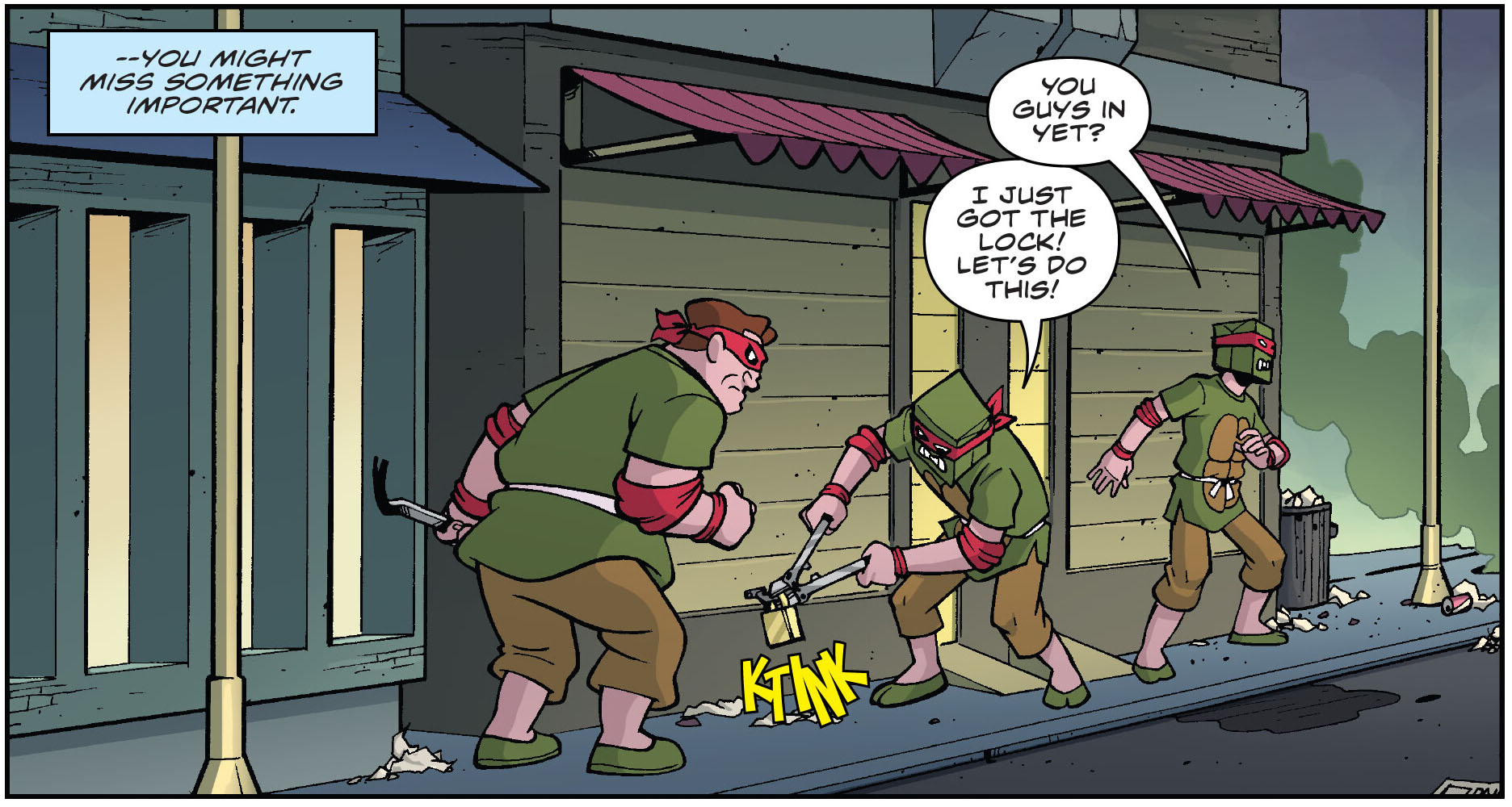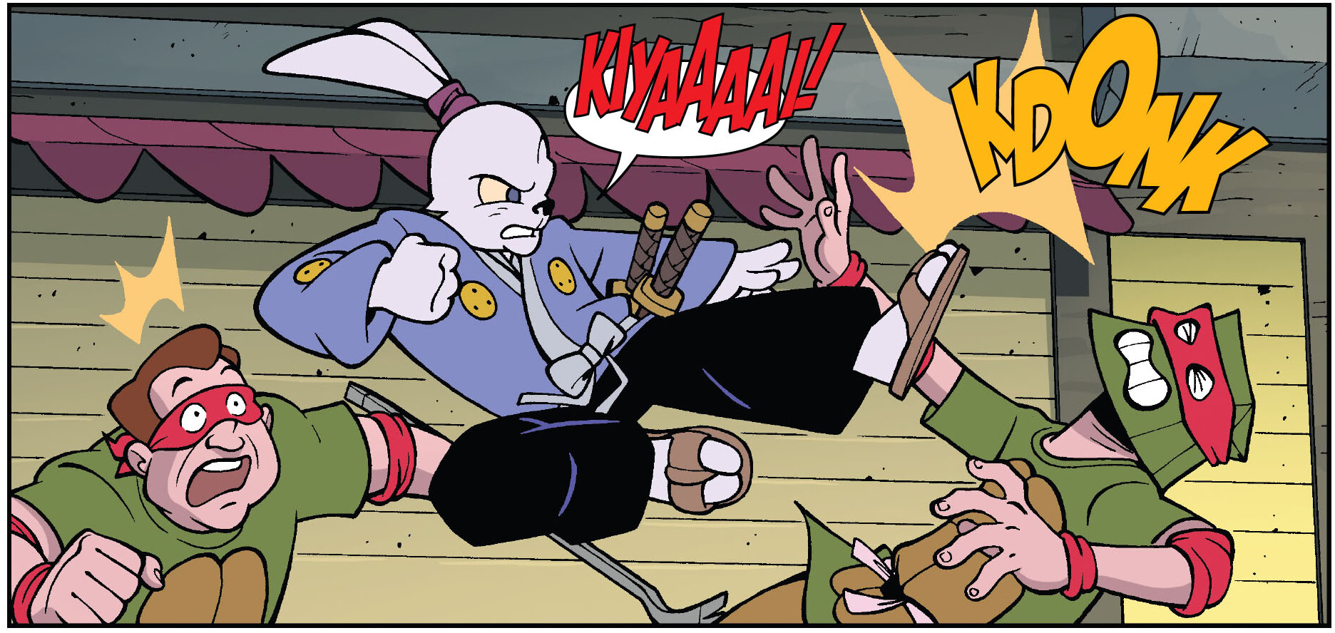 En pleine nuit, le gang des Crooked Ninja Turtles s’attaquait au rideau de fer d’une boutique. Mais trop bruyant, ils alertaient les grandes oreilles de quelqu’un… Usagi ! Le lapin protégeait le quartier depuis bien longtemps. Impossible pour Smash et ses hommes de le prendre au sérieux. Terrible erreur ! En quelques secondes, le visiteur d’une autre dimension se défaisait des voleurs sans la moindre peine. Dans son dos, il entendait des voix familières l’appeler. Il s’agissait des tortues, qui l’invitaient à repartir chez lui.