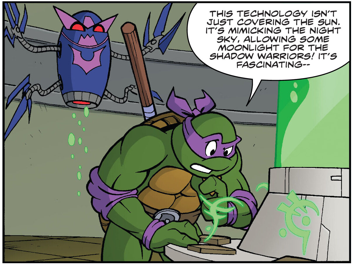 Une fois réarmés, les ninjas élaboraient un plan. Kai leur avait dit que leur monde était plongé dans l’obscurité depuis l’arrivée de Desmodus et de ses armées. Selon Donatello, une machine devait provoquer cette obscurité pour permettre à l’envahisseur de mieux s’adapter au lieu. Michelangelo et lui allaient désactiver cette machine. Pendant ce temps, les autres partaient affronter leur nouvel ennemi.