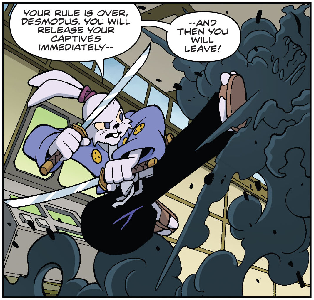 Pendant ce temps, les deux autres tortues et Usagi livraient un combat féroce face aux armées de Desmodus. Hélas la lumière des tortuecom’ était devenue inefficace face aux armées des guerriers de l’ombre. Ils devaient les combattre à l’ancienne. Les ennemis étaient nombreux et toujours aussi coriaces. Soudain, la lumière pénétra par les fenêtres du château, éblouissant les guerriers de l’ombre. Usagi et ses amis profitaient de cet affaiblissement pour en finir avec les soldats. Furieux, Desmodus se lançait sur le lapin, sabre à la main, pour en finir. Le ronin se montrait habile, comme à son habitude, et parait les attaques avant de riposter. La chauve-souris était désarmée, puis son armure volait en lambeaux. Bientôt, l’ennemi de tous les peuples apparaissait en sous-vêtements. Maigrichon, il se précipitait vers un petit vaisseau de secours et traversait le plafond pour retourner sur sa planète tout en promettant qu’il reviendrait.