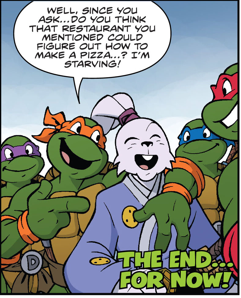 Hors de question pour les tortues d’abandonner leur ami à son sort. Mais Usagi se faisait du souci. Si les quatre frères se faisaient capturer, leur dimension courait un danger, notamment avec Shredder. Raphael rappelait à son ami aux longues oreilles que pour l’heure, leur ennemi était retenu dans une autre dimension (TMNT SMA #11).