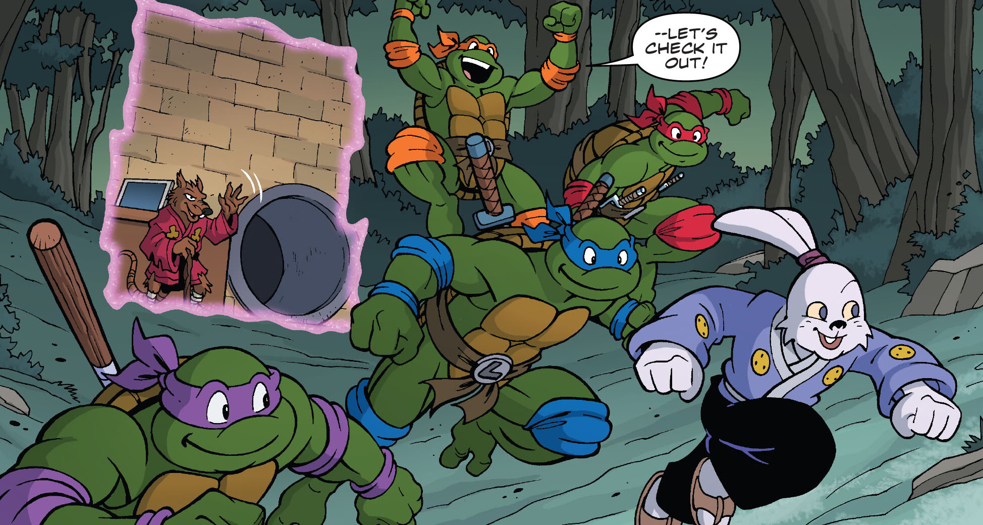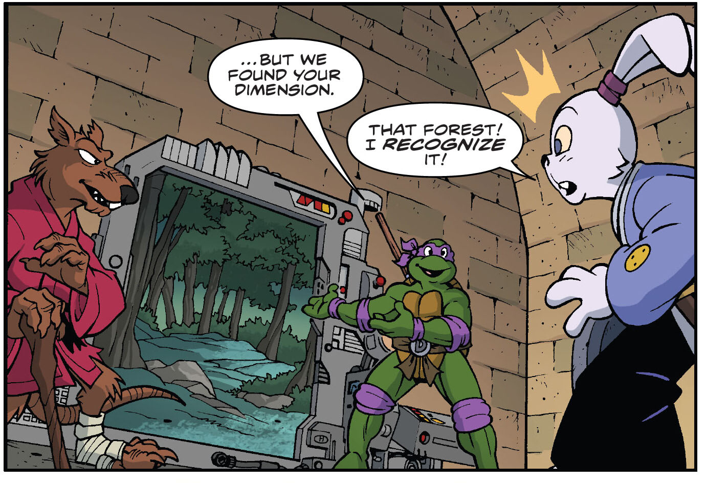 De retour au repaire, Donatello présentait à leur ami lapin sa dernière invention. À l’aide d’un programme informatique très avancé, il était parvenu à retrouver la dimension d’Usagi sur son portail interdimensionnel. Le lapin reconnaissait effectivement la forêt sur laquelle la machine ouvrait. Reconnaissant envers ses amis, Usagi les invitait à découvrir son monde.