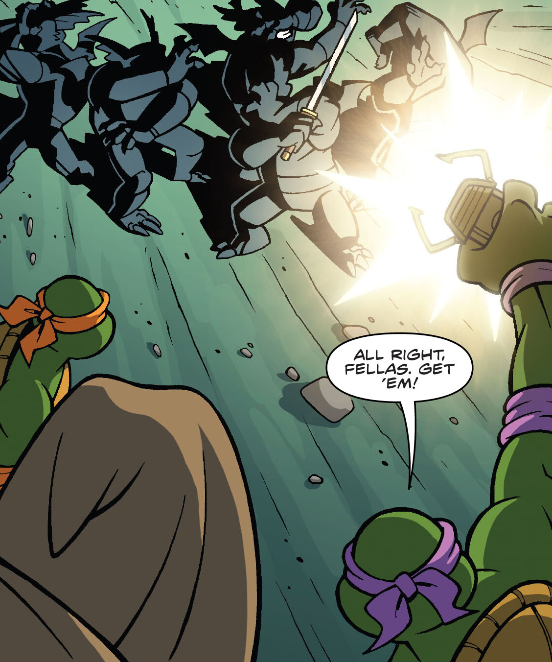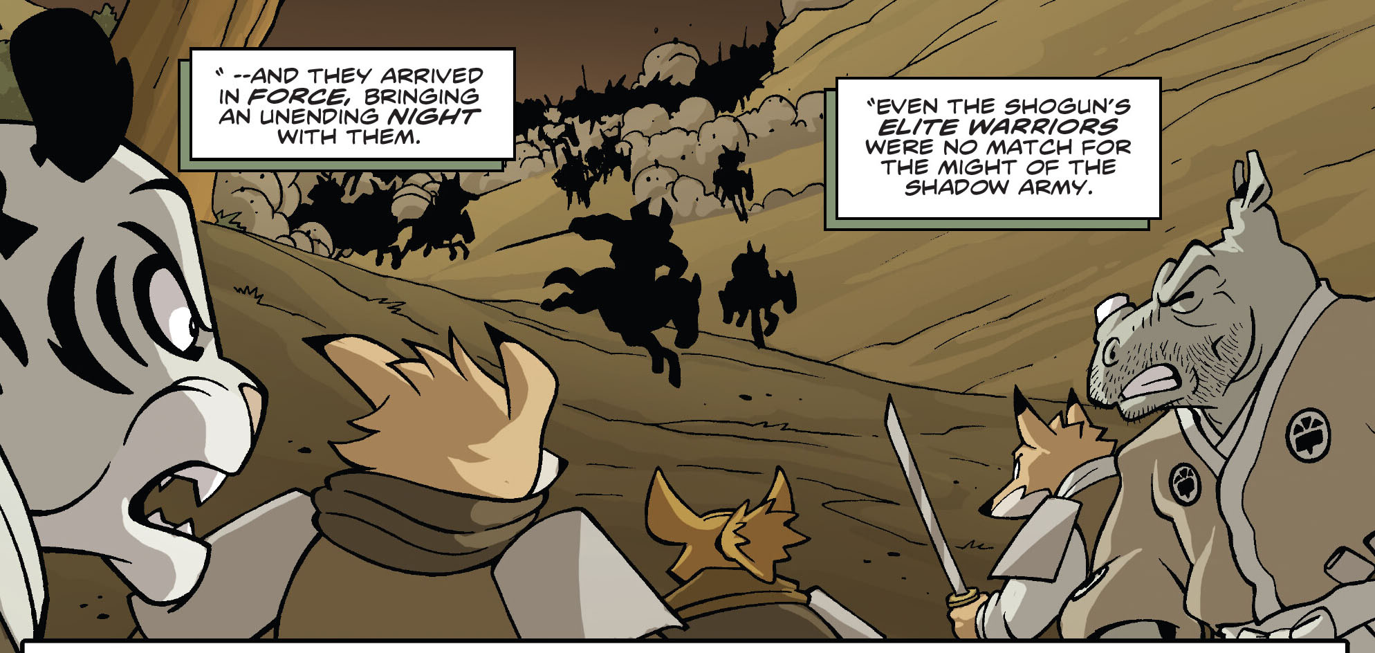 Leonardo était enchanté par le calme de celle-ci, bien différente du brouhaha qu’ils pouvaient entendre à Central Park ! Usagi voulait présenter le village à proximité à ses amis, mais quelque chose retenait son attention. Un bruit dans les bois lui faisait mettre sa lame au clair. Il sautait sur un ennemi que personne n’avait vu, sorte de grosse chauve-souris tapis dans l’obscurité. Les deux adversaires s’offraient un combat bien trop rapide et rude pour les tortues, qui n’auraient pas la moindre chance. Mais au fur et à mesure que le mystérieux ninja bougeait, il ressemblait plus à une ombre qu’à une forme réelle. Donatello bidouillait son tortuecom’ pour projeter de la lumière et y voir plus clair. La créature se montrait affaiblie. Usagi la jetait au sol d’un coup de pied, puis elle disparaissait dans un nuage de fumée. Jamais le lapin n’avait affronté un adversaire comme celui-ci.
