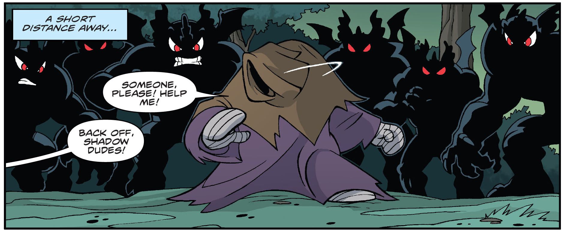 Usagi et les tortues traversaient les bois pour retrouver le château de Desmodus. Soudain, ils entendaient une voix qui appelait au secours. Ils se précipitaient à la rescousse d’un individu caché derrière une longue cape. Donatello s’empressait de rétablir la forte luminosité de son tortuecom’, qui avait déjà avalé une partie de sa batterie. Raphael trouvait l’attitude de la victime étrange. Elle savait que les guerriers de l’ombre étaient invincibles, mais elle demandait quand même de l’aide ?! Soudain, l’éclair de lumière balayait les armées, ce qui permettait aux ninjas d’en finir avec ces créatures. L’encapuchonné était impressionné. Mais surtout ravi d’avoir obtenu les réponses à ses questions.