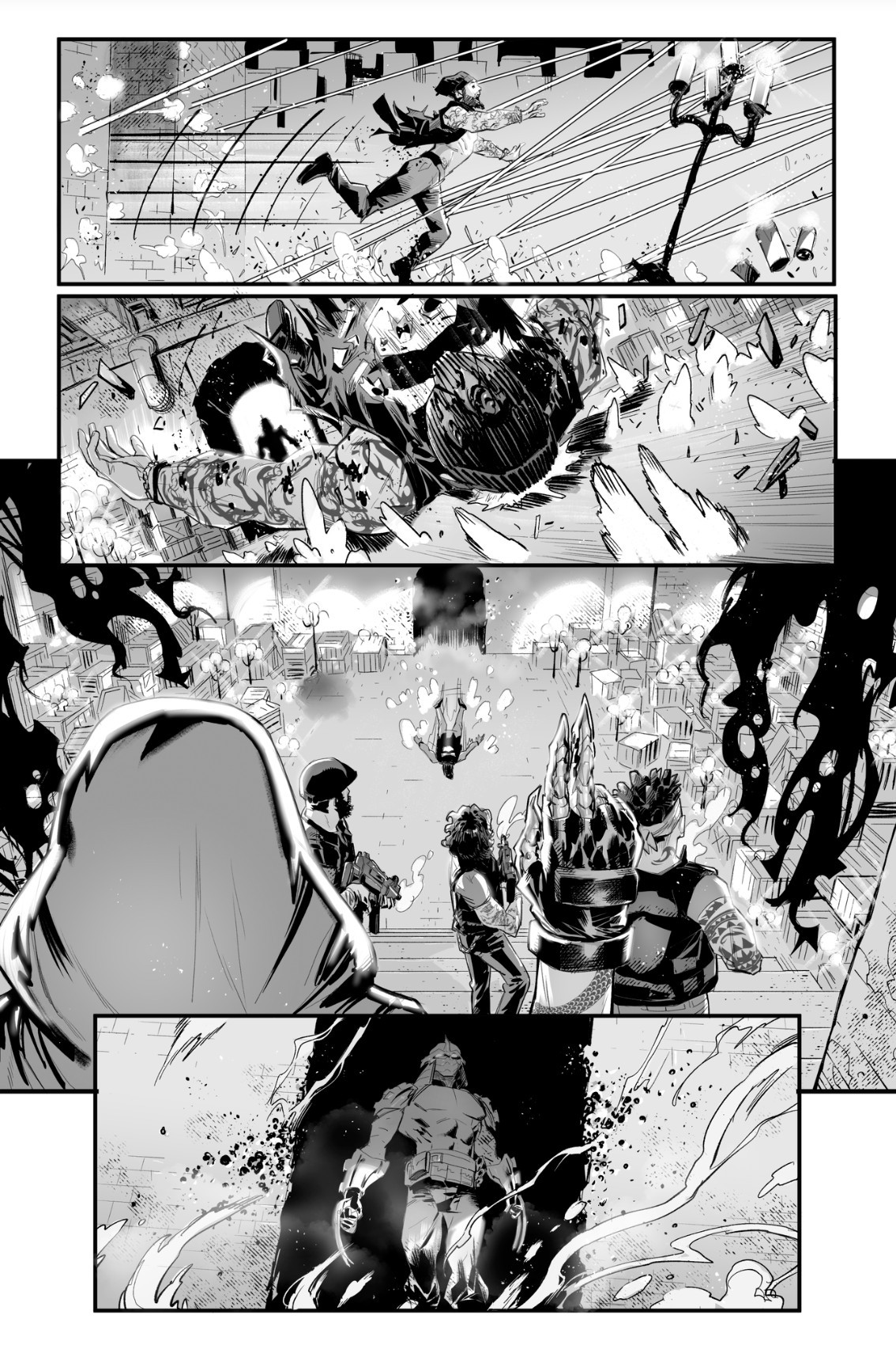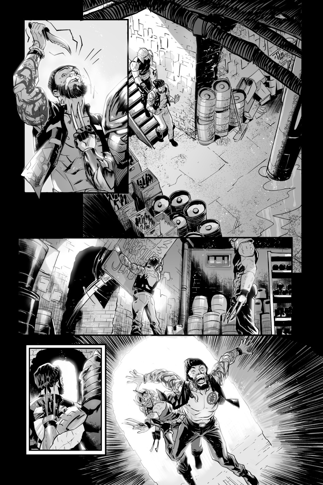 L’homme le conduisait dans la cave du bar. Il bougeait un panneau et lui indiquait la direction d’une galerie sombre. Shredder l’y poussait pour qu’il passe le premier. À peine franchit le petit corridor, bousculé par son adversaire, l’individu se faisait percer de nombreuses balles. Plusieurs hommes étaient en position, devant King Cobra, pour protéger la pièce. Ce dernier se montrait agréablement surpris de voir le grand Shredder face à lui. Cela faisait des années qu’il gérait son petit business de narcotrafiquant sous le nez de Saki, du temps où il était à la tête du Foot Clan. Si le japonais avait fait le choix d’imposer son empire au centre de Manhattan, à la vue de tous, King Cobra avait préféré entretenir sa légende. Son mythe était-il vrai ? Ou simplement une légende urbaine ? Un moyen idéal pour faire prospérer un empire.