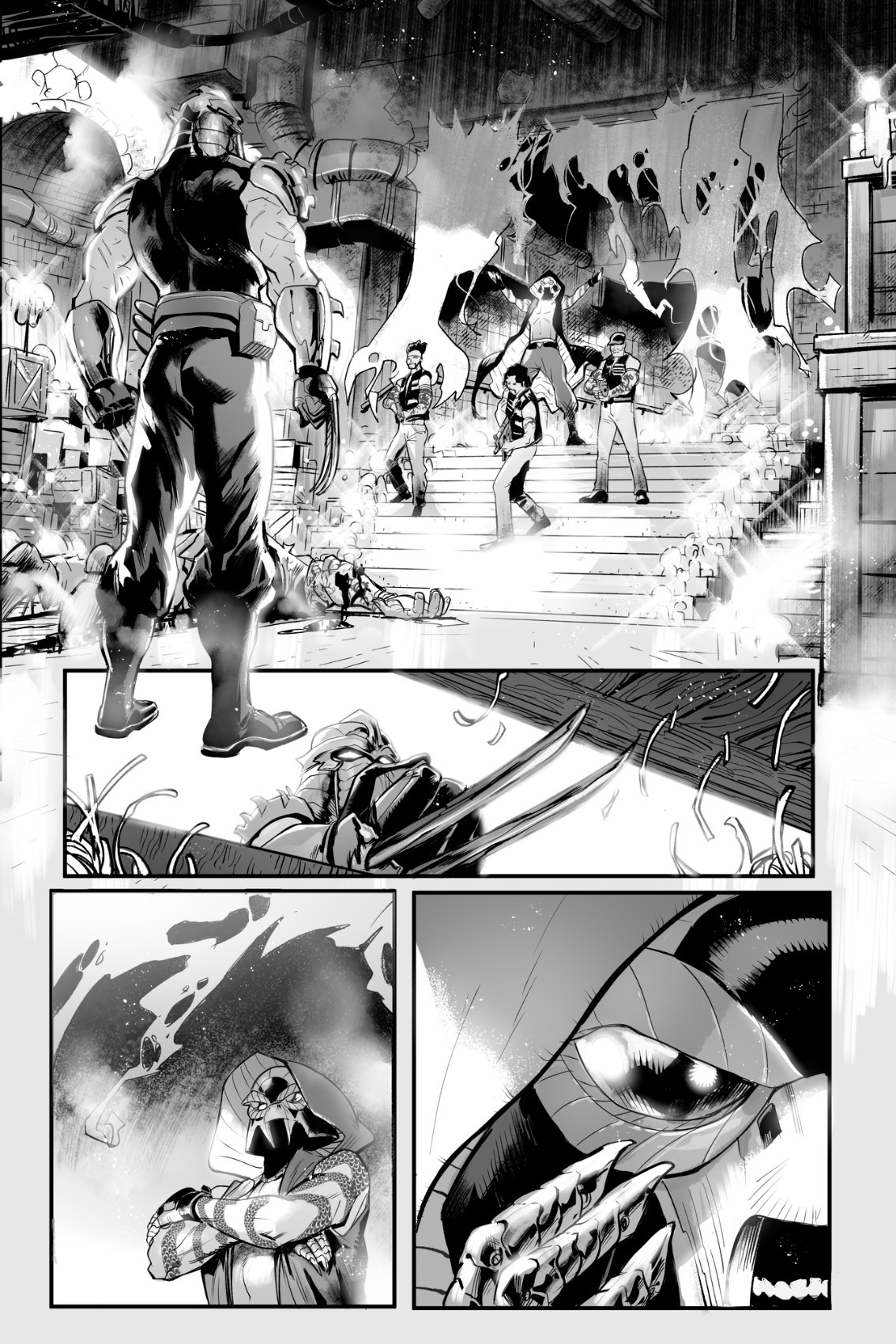 Le soir venu, Shredder entrait dans un bar malfamé du nom de Snake Pit. Il s’avançait jusqu’au comptoir pour se faire chasser par la gérante. Les armes n’étaient pas tolérées dans ce lieu d’après elle. L’homme en armure n’écoutait pas sa remarque et demandait à parler au King Cobra. La femme insistait et menaçait même d’appeler la police. Calme et menaçant, Shredder lui signifiait ne pas la croire ; jamais ils n’appelleraient la police dans un tel trou à rats. S’il marquait un point, la femme avait bien l’intention d’appeler quelqu’un pour le sortir et prenait son téléphone. Une bagarre risquait d’éclater à tout moment…