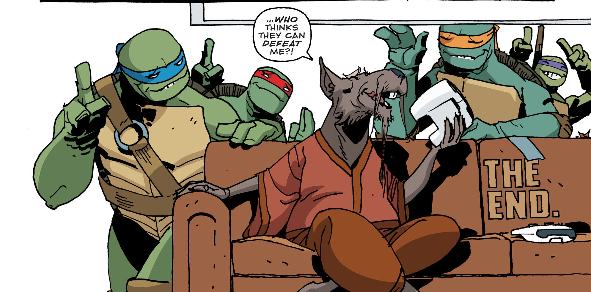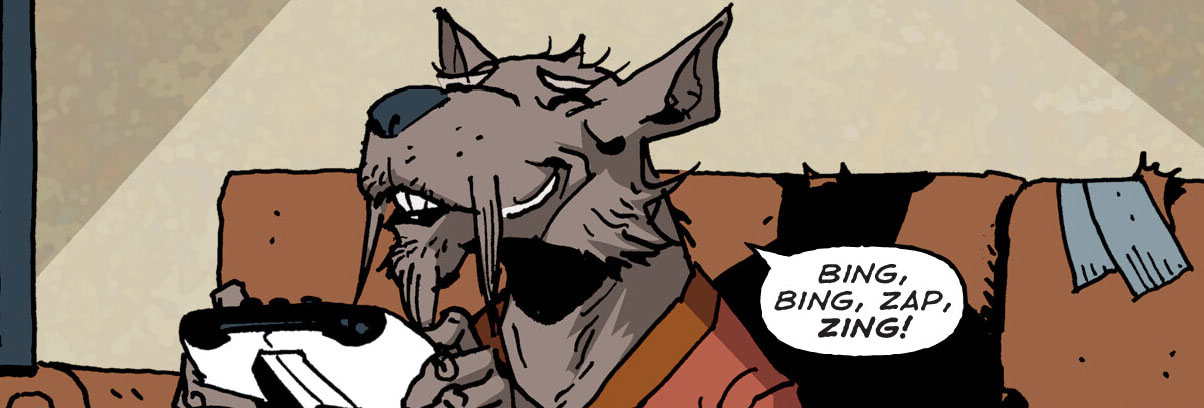 Splinter rebondissait habilement sur les remarques de ses fils en leur rappelant que le meilleur moyen de se détendre, lorsque l’on était le père de quatre tortues était lorsque celles-ci se faisaient absentes ! Il saisissait une manette de jeu et proposait à ses fils de le défier !