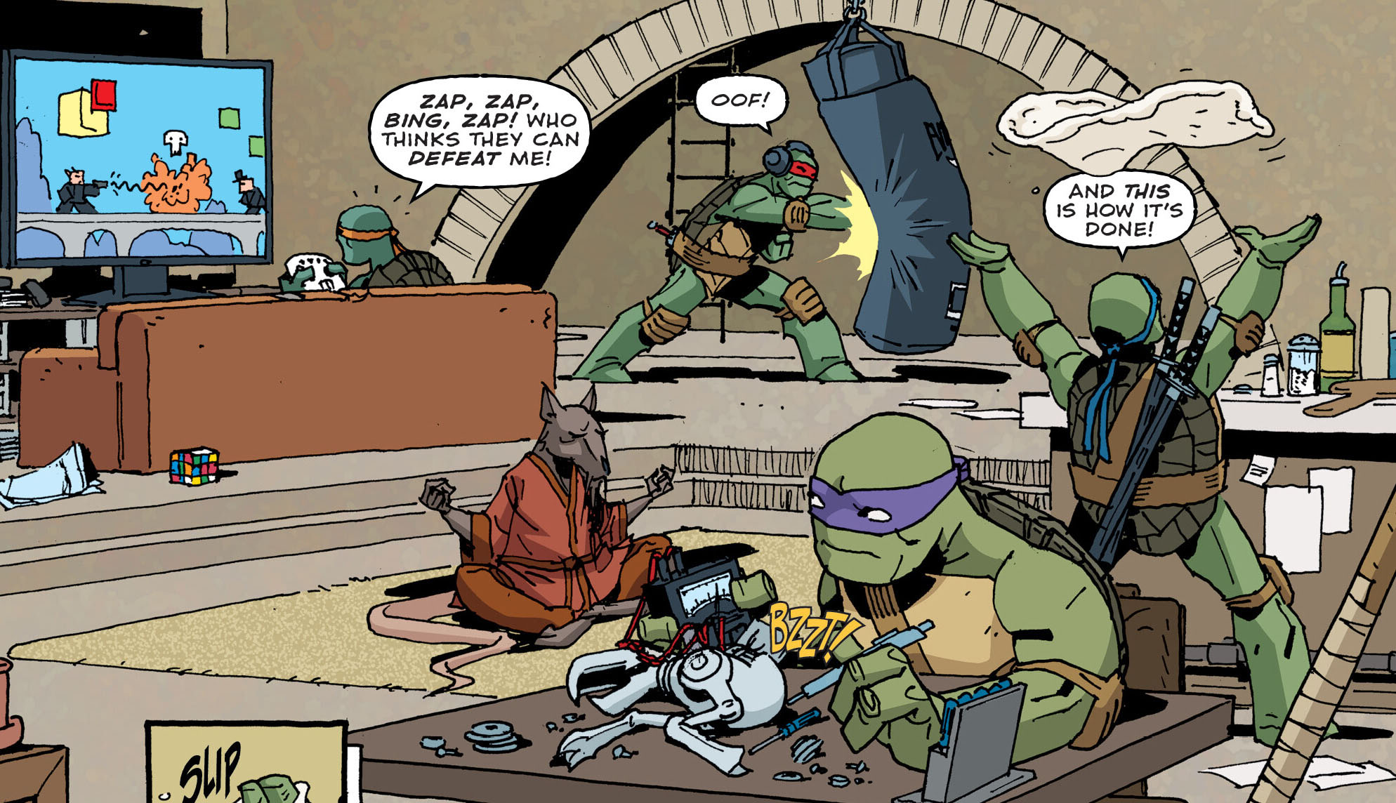 Les tortues vaquaient à leurs occupations, tandis que Splinter méditait tranquillement autour de ses fils. Michelangelo explosait son score dans un jeu-vidéo, Raphael s’entraînait sur son punchingball, Leonardo préparait la pâte à pizza et Donatello bricolait le cadavre d’un Mouser. Mais soudain, ce dernier recevait la pâte sur la tête alors qu’il opérait une phase délicate sur le petit robot. Il n’était pas le seul à se faire déranger, Raphael en avait assez d’entendre les bruits du jeu de son frère. Il n’entendait même pas sa propre musique dans son casque durant son entraînement ! Michelangelo se faisait balayer par le punchingball qui volait dans sa figure.