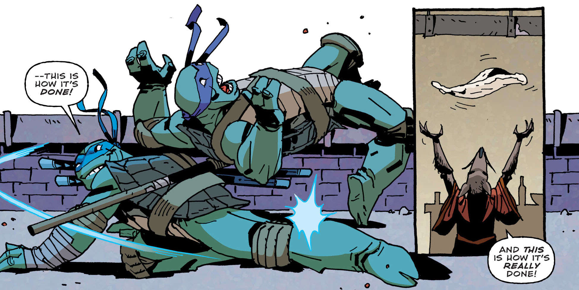 Les tortues rentraient, affamées. Donatello précisait à son frère qu’il devait encore y avoir une pizza dans le congélateur. Le mot que le rat redoutait tant. Pas pizza, mais bien congélateur ! Il avait caché toutes les preuves de son combat à l’intérieur pour gagner du temps ! Michelangelo ouvrait la petite porte et se faisait attaquer par un tas de poussière, de boulons et d’objets cassés, dont le Mouser.