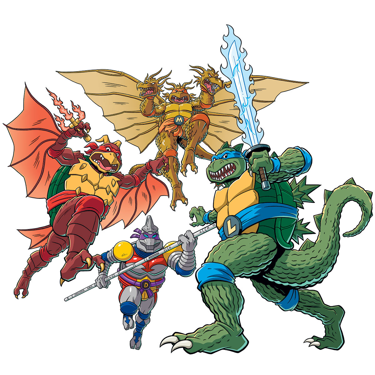 L’artiste Dan Schoening (TMNT x Ghostbusters, TMNT Saturday morning adventures) a travaillé avec Playmates Toys pour l’élaboration de ces figurines. Il a partagé les concept arts de ces trois premières pièces. Il avait pensé à faire de Michelangelo King Caesar avant de se raviser, voulant surtout mettre l’accent sur King Ghidorah (source). Le packaging a été imaginé par Jacob Chabot, qui en a partagé l’illustration originale (source).