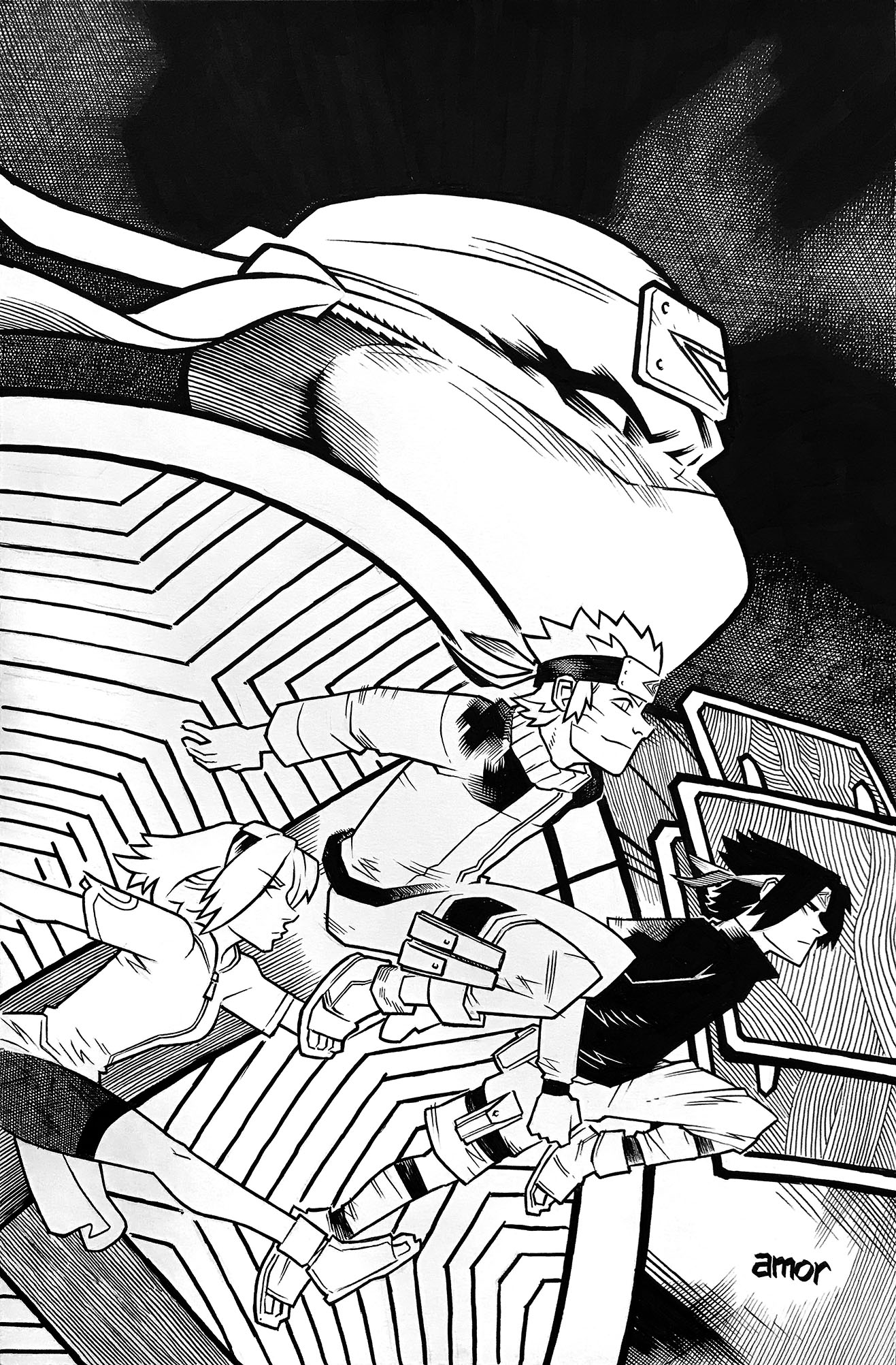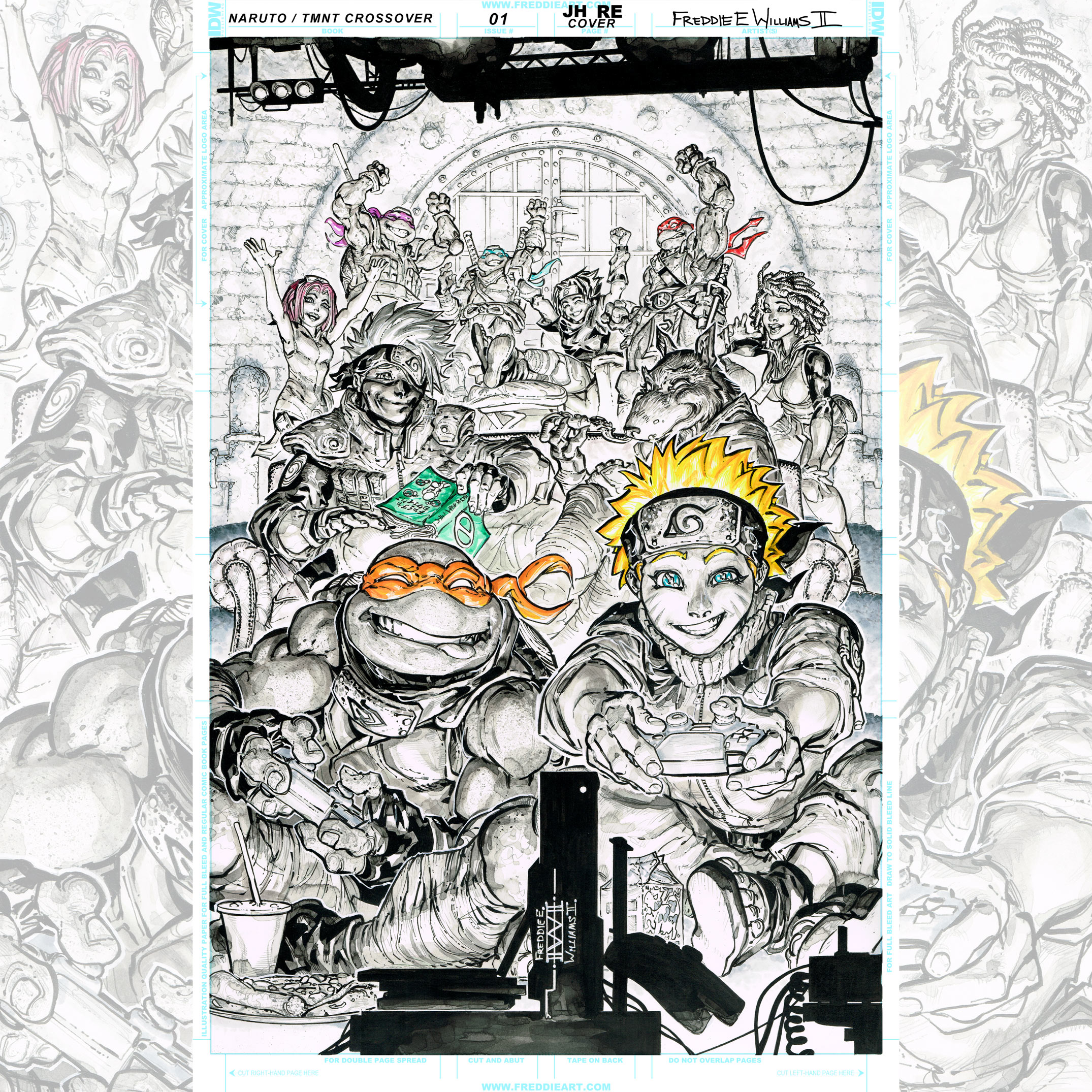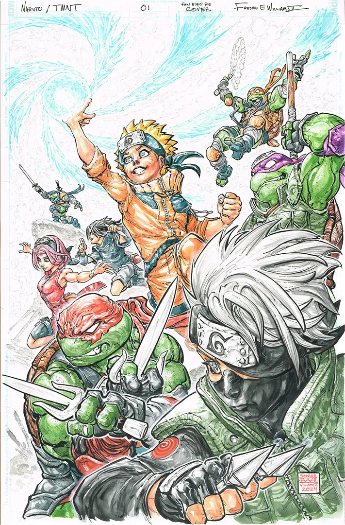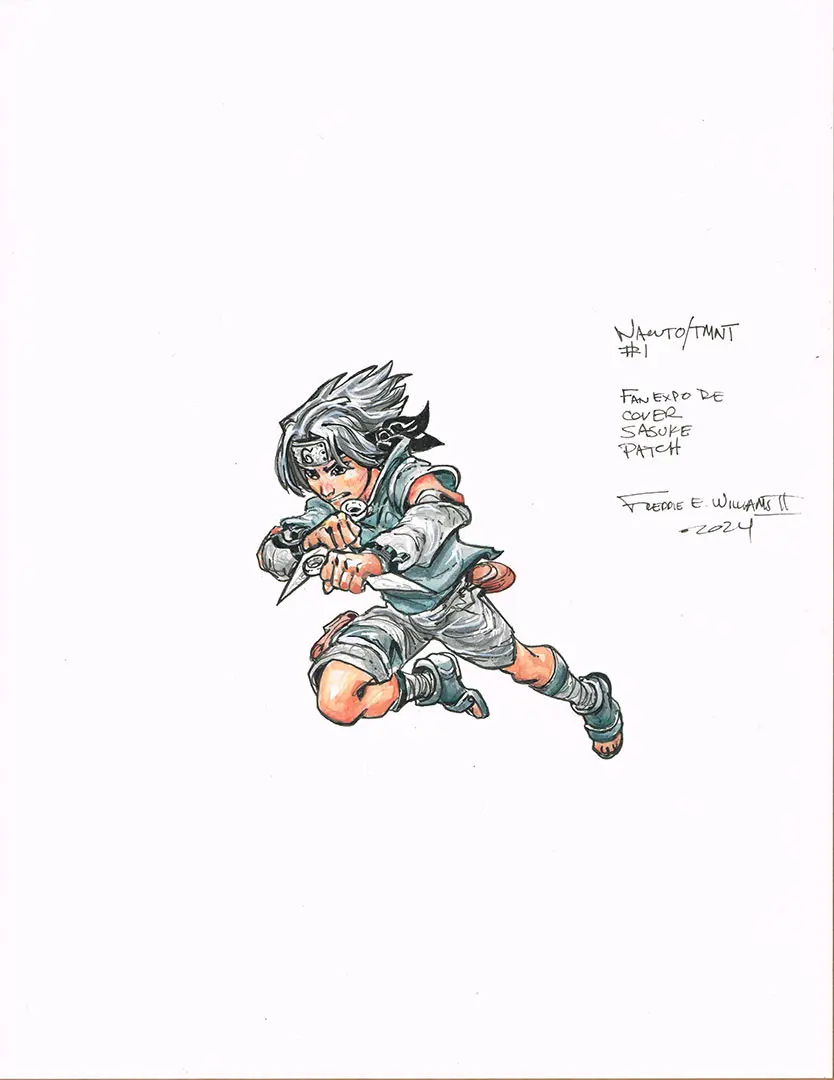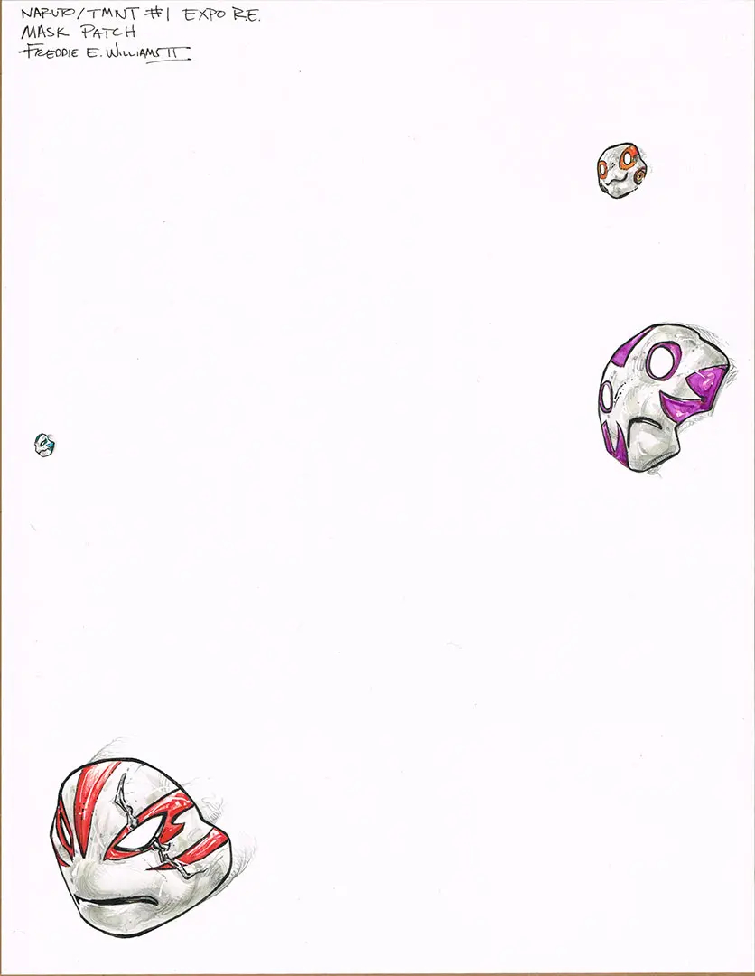 L’artiste Freddie Williams a publié les pièces originales pour la couverture de ce numéro. On y voit différents calques qui vienennt se superposer, comme les masques des tortues, mais aussi une évolution dans la position de Sasuke, qui évolué jusqu’à la publication de cette couverture.