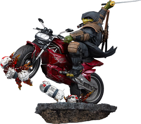 Après le grand succès de la première statuettes de The last ronin par PCS, sortie fin 2022 aux États-Unis, le fabricant a lancé une deuxième pièce, cette fois bien plus massive, le 2 mars 2023. Limitée à 500 exemplaires, elle présente notre dernier ronin en croisade sur sa moto. Le design est toujours repris du comic à succès d’IDW Publishing sous les traits des frères Kucharek.